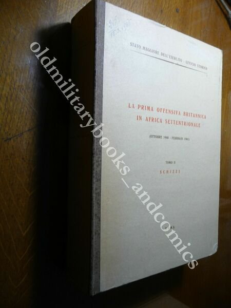 TITOLO: LA PRIMA OFFENSIVA BRITANNICA IN AFRICA SETTENTRIONALE OTTOBRE 1940-FEBBRAIO 1941 TOMO II SCHIZZI DESCRIZIONE: Stato Maggiore dell'Esercito Ufficio Storico Roma 1960 vol. in cofanetto contenente le carte della battaglia in 8°. CONDIZIONI: Buone, piccola rottura al piede del cofanetto. Il volume prevede 24 carte ma MANCA LA CARTA nm 2. PESO / WEIGHT: 1000 gr. without package