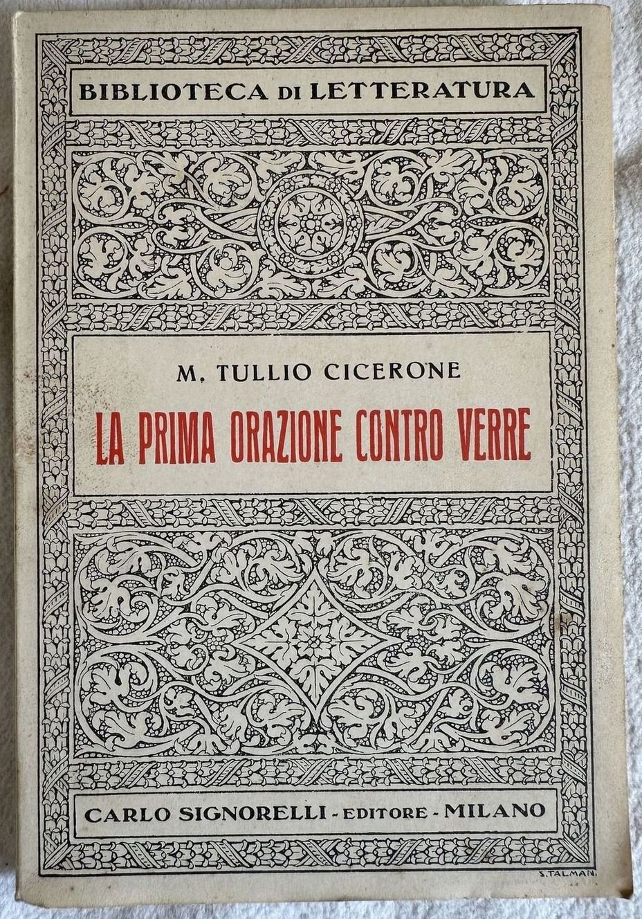 Edizione Signorelli del 1953 della collana "Biblioteca di letteratura" dell'opera classica "La prima orazione contro Verre" di Marco Tullio Cicerone. Versione con introduzione di Ettore D'Avanzo. L'opera è completa. Graziose brossure con decorazioni. In buone condizioni. Copertina editoriale in ottime condizioni con lievi usure ai margini e dorso. Legatura in buone condizioni. All'interno le pagine si presentano in buone condizioni con fioriture. In 16. Dim. 15,5x10,5 cm. Pp.47+(1)Signorelli edition of 1953 of the series "Biblioteca di letteratura" of the classic work "La prima orazione contro Verre" by Marco Tullio Cicerone. Version introduction and notes by Ettore D'Avanzo. Nice decorations on the covers. In good conditions. Editorial cover in very good conditions slightly worn in the edges and spine. Binding in good conditions. Inside pages are in good conditions with foxing. In 16. Dim. 15,5x10,5 cm. Pp.47+(1)