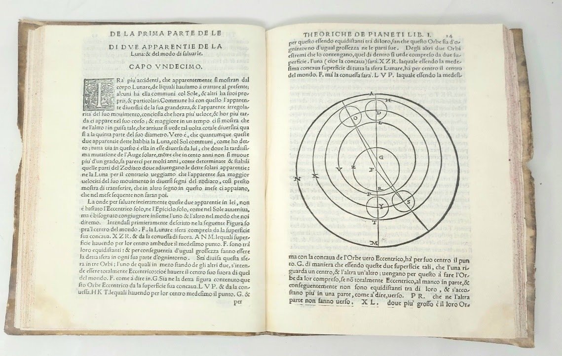 >in-4 piccolo, ff. (10), 63, (1), legatura coeva in pergamena floscia (macchie e piccoli difetti). Impresa dello stampatore al titolo, varie lettere iniziali istoriate e ornate, 38 diagrammi, principalmente astronomici, a mezza pagina n.t. in xilografia. Prima rara edizione di questo trattato cosmologico ed astronomico di Alessandro Piccolomini (Siena 1508-1578), della stessa famiglia di Papa Pio II, uomo di varia e vasta cultura: scrittore eclettico, scienziato e letterato autore, tra l'altro, del celeberrimo trattato ''De la sfera del mondo''. Fu tra i fondatori degli ''Intronati'' col nome di Stordito, insegnò filosofia morale a Padova e poi a Roma; nel 1574 ebbe il titolo di arcivescovo di Patrasso. Precede il testo la dedica a stampa a Cosimo de Medici. L'opera fu concepita come una sorta di completamento ''Della Grandezza della Terra e dell'Acqua'', dello stesso autore, pubblicata nel 1558, relativa a geografia e cartografia. Piccolomini è anche noto per aver pubblicato nel 1540 il primo atlante delle stelle. Di questa edizione sono note due differenti tirature: una con indicazione tipografica dello Ziletti e relativa impresa, come il presente esemplare, l'altra con riferimento a Varisco e sua impresa editoriale, entrambe deo 1558. Cantamessa 6106: “Il taglio dell'opera è prevalentemente astronomico, anche se, come ne La Sfera, Piccolomini chiama astrologi gli astronomi, a conferma ennesima della commistione concettuale ed espressiva tra astronomia e astrologia nel XVI Secolo. Colloca cioè in uno stesso contesto chi osservava e misurava il cielo e chi da questo traeva predizioni e previsioni. Così, Piccolomini tratta, fra l'altro, anche degli aspetti tra i Pianeti (dalla carta 59) e riproduce quelli classici dell'astrologia, accennando anche a quelli benigni e a quelli maligni, e dunque, così scrivendo, miscela due discipline diverse.” Buon esemplare, assai genuino. Adams P-1119. Houzeau & Lancaster 2494. Riccardi I (2) 272-73. BMC 514.