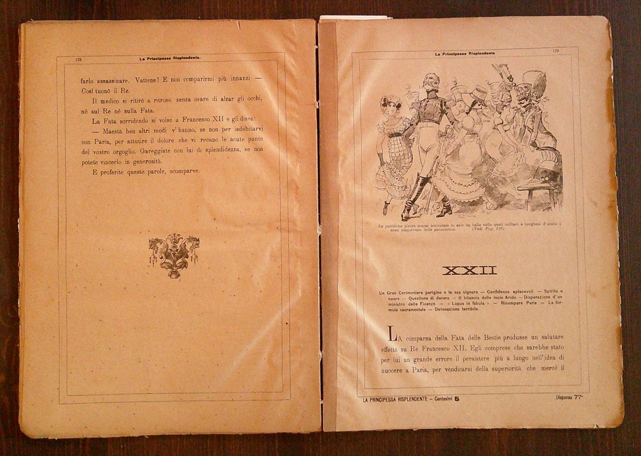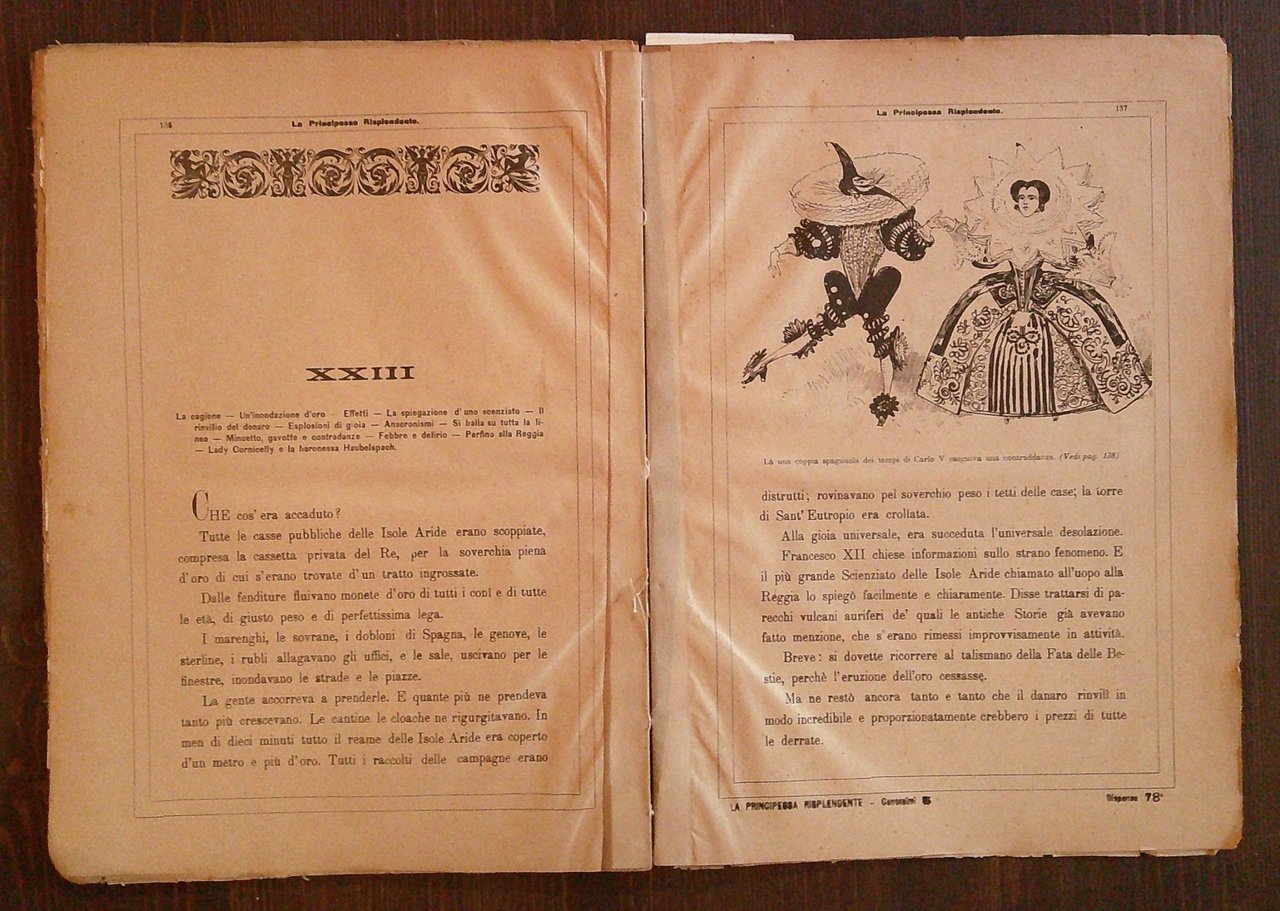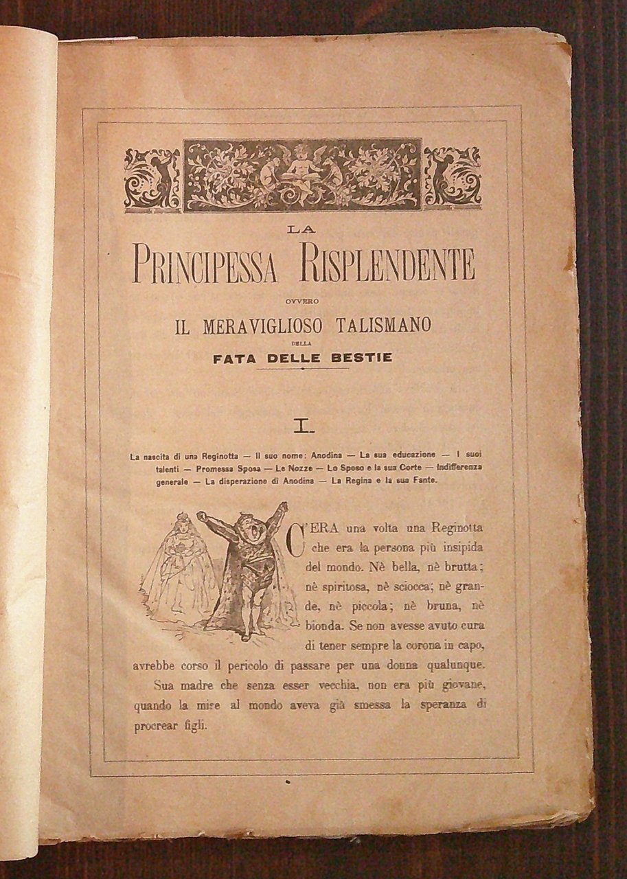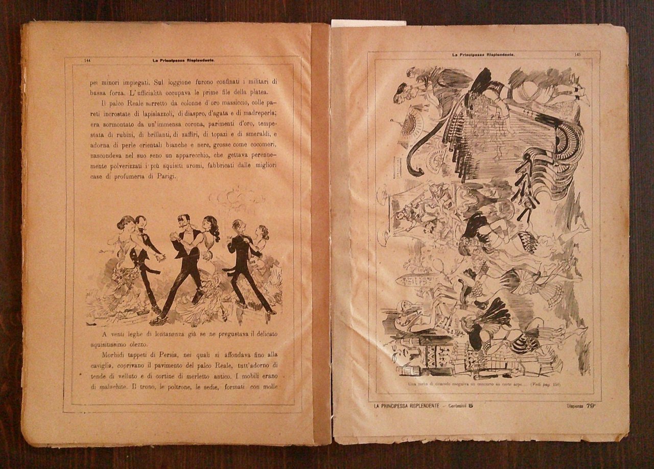 La Principessa Risplendente ovvero il meraviglioso Talismano della Fata delle Bestie. Illustrazioni in b/n n.t., anche a piena pagina, di Bertall. Editore Edoardo Perino - Roma, 1888. Opera completa in Dispense (da 61 a 80) cucite insieme al dorso ma priva di copertina. Barbe e imperfezioni del tempo al margine esterno delle pagine, alcune presentano un rinforzo alla cerniera e qualcuna dei piccoli restauri marginali e sporadiche e lievissime fioriture. 22,5x31; pp.160 non numerate. Molto Raro e in Buono stato. , Buono (Good)