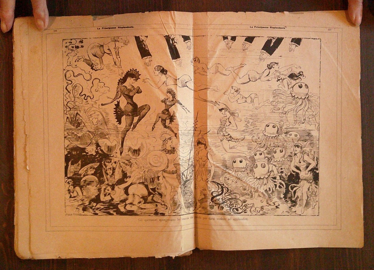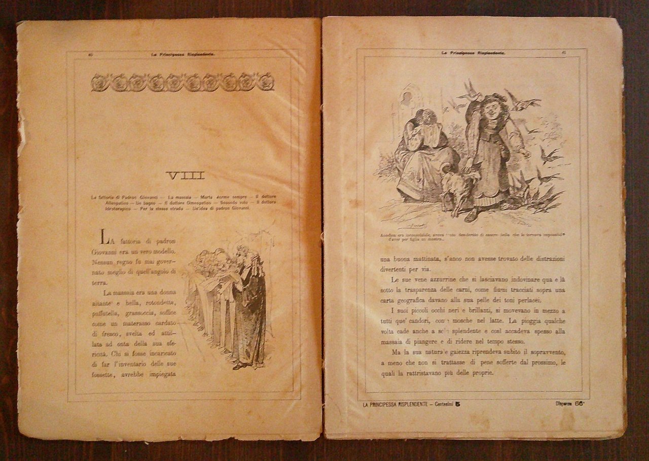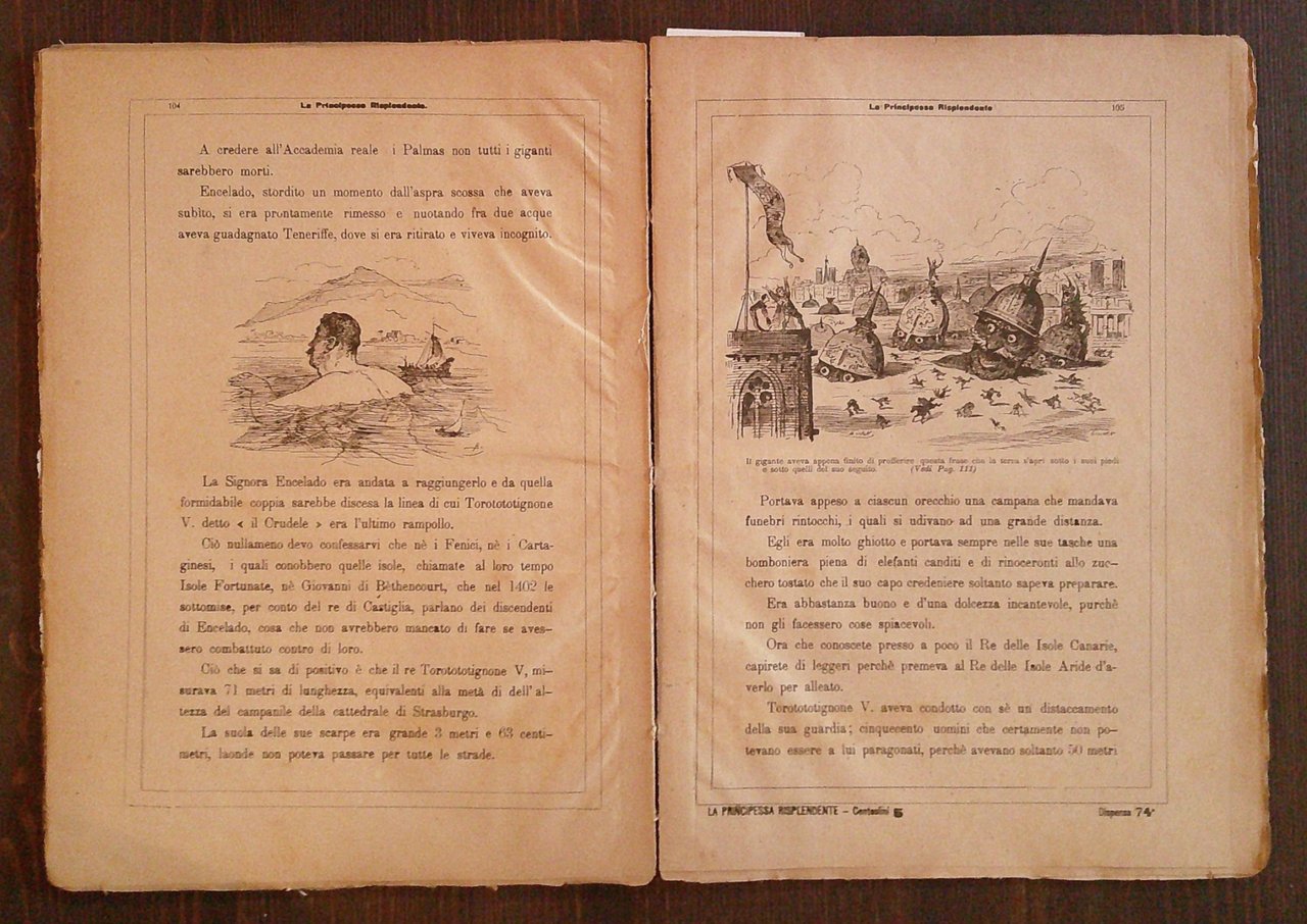 La Principessa Risplendente ovvero il meraviglioso Talismano della Fata delle Bestie. Illustrazioni in b/n n.t., anche a piena pagina, di Bertall. Editore Edoardo Perino - Roma, 1888. Opera completa in Dispense (da 61 a 80) cucite insieme al dorso ma priva di copertina. Barbe e imperfezioni del tempo al margine esterno delle pagine, alcune presentano un rinforzo alla cerniera e qualcuna dei piccoli restauri marginali e sporadiche e lievissime fioriture. 22,5x31; pp.160 non numerate. Molto Raro e in Buono stato. , Buono (Good)