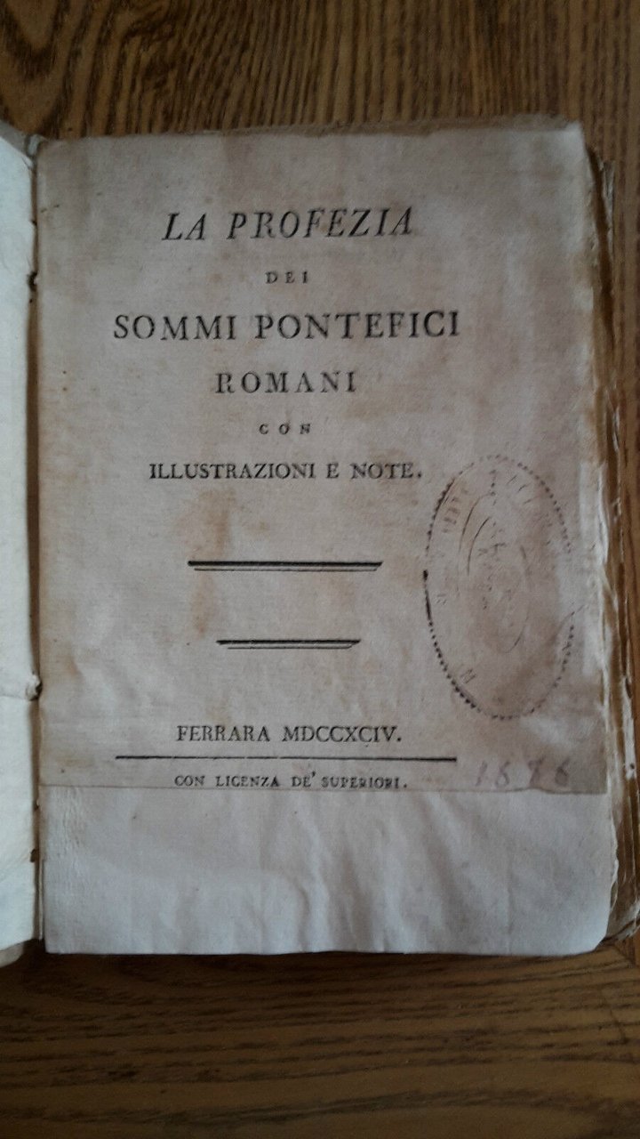 LA PROFEZIA DEI SOMMI PONTEEFICI ROMANI CON ILLUSTRAZIONI E NOTE FERRARA 1794In