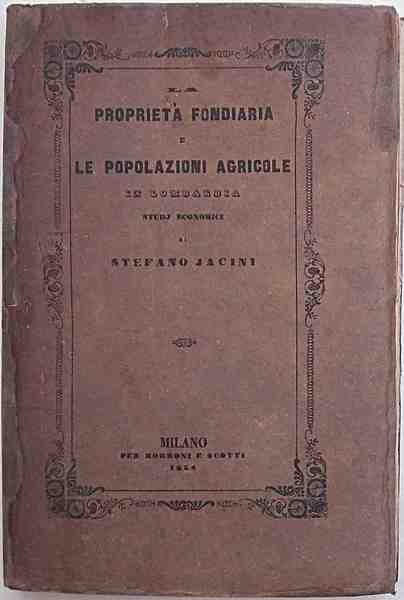 In 8° (cm. 22 x 15); pagg. 306, (2); con 1 tabella ripieg. f.t.; brossura ben rifatta con carta antica e originale al piatto. Fioriture. VG-. ** Rara edizione originale. Realizzato per rispondere alla richiesta della Società d'Incoraggiamento delle scienze lettere e arti di Milano: "Esporre le condizioni economiche e morali delle popolazioni agricole della Lombardia nei loro rapporti con la possidenza e col vario genere di coltura, esaminando specialmente l'influsso dei contratti di affittanza e di colonia parziaria in uso nelle diverse sue parti; additare i mezzi più opportuni per giovare alla possidenza e recar sollievo ai coltivatori. ed esaminando se gli istituti di credito agrario sieno immediatamente applicabili al nostro paese"."