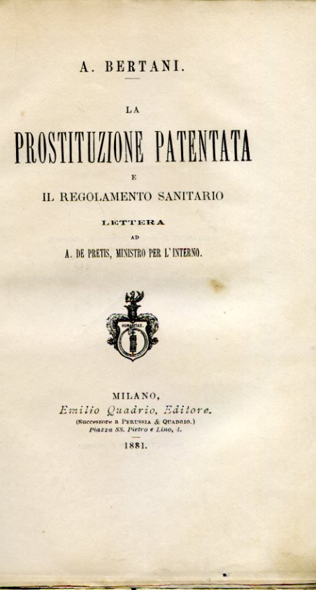 In-8°, pp. 93, brossura posteriore. Ben conservato. Prima edizione. Articolato studio di uno dei maggiori statisti dell'Italia del tempo sul problema sociale della prostituzione e sulla sua regolamentazione sanitaria. 'Lo studio della questione sanitaria costituiva per il Bertani l'occasione per riportare in primo piano l'indagine sulla personalità del contadino italiano, con particolare riguardo alle sue condizioni sociali e alle carenze igienico-sanitarie del settore. Ma le spese, da lui compiute a scapito dell'inchiesta principale, e l'invadenza con cui sconfinava negli argomenti delle singole zone suscitarono l'opposizione dei colleghi, contro cui egli ricorse al governo, presieduto dall'amico Depretis. Ottenne così dal ministero dell'Interno l'incarico di un lavoro preparatorio per un codice di pubblica igiene e di specifiche ricerche sull'igiene rurale, ma tali interferenze dell'esecutivo esacerbarono maggiormente i commissari. I lavori dell'inchiesta principale procedettero, tra varie vicende, fino a concludersi nel 1885. Nello stesso anno il Bertani presentò lo schema di codice per la pubblica igiene, mentre concludeva i lavori la commissione d'inchiesta sulla prostituzione, della quale egli pure aveva fatto parte.' (Bruno Di Porto in D.B.I., IX, 1967).