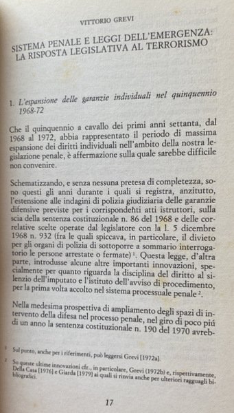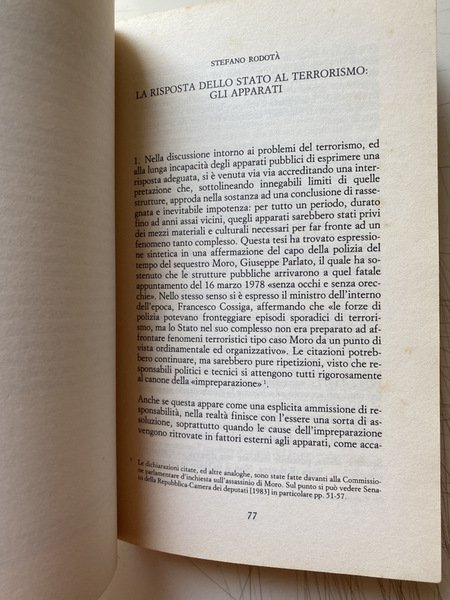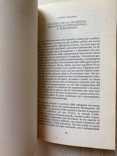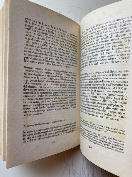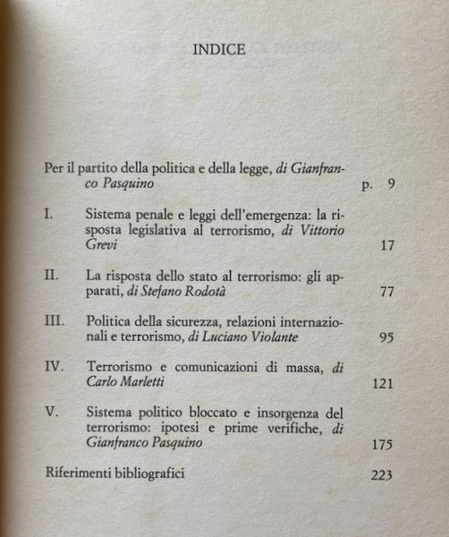 Soggetti: Politica, Fenomeni terroristici, Terrorismo, Lotta armata, Scienze sociali, Anni di Piombo, Sicurezza, Sinistra extraparlamentare, Gruppi armati, Eversione, Anni Settanta, Anni Ottanta, Brigate Rosse, Marxismo-leninismo, Comunismo, Governo, Propaganda, Comunicazione, Bande armate, Geopolitica, Relazioni internazionali, Italie, Politique de sécurité, Terrorisme, Communication de masse, Systeme politique, Terrorismus, Italien, Aufsatzsammlung, Saggi, Violenza politica, Donatella Della Porta, Storia d'Italia, Attualità, Clandestinità, Organizzazioni clandestine, Democrazia, Antiterrorismo, Giustizia sociale, Red Brigades, Guerriglia urbana, Rivoluzione, Rivoluzionari, Contestazione, Guerra civile, Prima Repubblica, Francia, Golpe, Sessantotto, Anni Sessanta, Ideologie politiche, Sistema penale, Pentiti, Legge, Leggi speciali, Apparati, Stato, Lavoro, Vittime, Omicidi, Stragi, Stagione stragista, Attentati, Aldo Moro, Rapimenti, Partiti politici, Connivenze, Partito socialista, Democrazia Cristiana, Chiesa, Neofascismo, Fascisti, Scontri, Giulio Andreotti, Bettino Craxi, Brigadisti, Autonomia operaia, Resistenza, Lotta continua, Cattivi Maestri, Intellettuali, Università, Movimenti studenteschi, Clima politico, Leggi, Emergenza, Carcere, Processo penale, Costituzione, Diritto, Garanzie, Grevi, Giarda, Raffaele Cutolo, Caso Cirillo, Mario Moretti, Francesco Cossiga, Servizi Segreti, Commissione parlamentare, Relazioni parlamentari, Inchieste, Corte, Sentenze, Luigi Bonanate, Potere operaio, Direzione strategica, Ted Robert Gurr, Prima Linea, Aspetti giuridici, Consultazione, Riferimento, Bibliografia, Collezionismo, Libri rari Vintage Fuori catalogo, Giornalismo, Istituzioni, Protezione, Mitterand, Tony Negri, Battisti, Esilio, Strategia della tensione, Piazza Fontana, Unione Sovietica, Stati Uniti, Guerra Fredda, Sequestro, Estremismo, Soccorso rosso, Autunno caldo, NAR, Germania, Rote Armee Fraktion (RAF), Nuclei Armati Proletari (NAP), Avanguardia Nazionale, Destra, Renato Curcio, Alberto Franceschini, Carlo Alberto dalla Chiesa, Stazione, Bologna, Ernesto Galli della Loggia, Dibattito storico, Indro Montanelli, Criminalità, Movimento del '77, Margherita Cagol, Sergio Zavoli, Prospero Gallinari, Barbara Balzerani, Valerio Morucci, Adriana Faranda, Giovanni Senzani, Franco Bonisoli, Valpreda, Arresti, Libertà provvisoria, Sisde, Simi, Sifar, Patrizio Peci, P2, Massoneria, OP, Dissociazione, Polizia, Giuseppe Parlato, Conso, Illuminati, Carlassare, Salvini, Battaglini, Galli, Pisapia, Nobili, Giurisprudenza, Feltrinelli, Gap, Immobilismo statale, Sequestro Sossi, Classe operaia, Repressione, Fenomeni criminali, Capitalismo, Mass Media, Francesco Alberoni, Opinione pubblica, Società civile, Yonah Alexander, Collaborazionismo, Analisi, Chiavario, Ordine pubblico, Stampa, Editoria, Giornali, Furio Colombo, Carlo Taormina, Donat Cattin, Intercettazioni, Corte Costituzionale, Magistratura, Umberto Eco, Informazione, Gaetano Vassalli, Gustavo Zagrebelsky, Politics, Terrorist phenomena, Terrorism, Armed struggle, Social sciences, Years of Lead, Security, Extra-parliamentary left, Armed groups, Eversion, Seventies, Eighties, Red Brigades, Marxism-Leninism, Communism, Government, Propaganda, Communication, Armed gangs , Geopolitics, International relations, Essays, Political violence, History of Italy, Current affairs, Clandestine organizations, Democracy, Counterterrorism, Social justice, Urban warfare, Revolution, Revolutionaries, Contestation, Civil war, First Republic, France, Coup, Italy, Sixties, Political ideologies, Penal system, Repent, Law, Special laws, Apparatuses, State, Work, Victims, Murders, Massacres, Massacre season, Bombings, Kidnappings, Political parties, Connivences, Socialist party, Christian Democracy, Church, Neofascism, Fascists, Clashes, Brigadists, Workers' autonomy, Resistance, Continuous struggle, Bad Masters, Intellectuals, Universities, Student movements who, Political climate, Emergency, Prison, Criminal trial, Constitution, Law, Guarantees, Secret services, Parliamentary commission, Parliamentary relations, Inquiries, Court, Sentences, Worker power, Strategic direction, Front line, Legal aspects, Consultation, Reference, Bibliography, Collectables, Rare books Out of print, Journalism, Institutions, Protection, Exile, Tension strategy, United States, Cold War, Kidnapping, Extremism, Red aid, Hot autumn, Germany, Proletarian Armed Forces, National Vanguard, Right, Station, Debate historical, Crime, '77 Movement, Arrests, Provisional freedom, Freemasonry, Dissociation, Police, Jurisprudence, State real estate, Working class, Repression, Criminal phenomena, Capitalism, Public opinion, Civil society, Collaborationism, Analysis, Public order, Press, Publishing, Newspapers, Wiretapping, Constitutional Court, Judiciary, Information