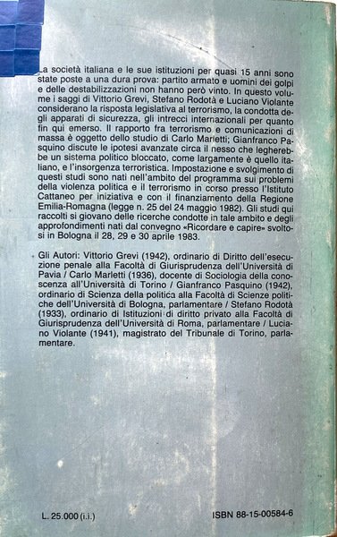 La società italiana e le sue istituzioni per quasi 15 anni sono state poste a una dura prova: partito armato e uomini dei golpi e delle destabilizzazioni non hanno però vinto. In questo volume i saggi di Vittorio Grevi, Stefano Rodotà e Luciano Violante considerano la risposta legislativa al terrorismo, la condotta de gli apparati di sicurezza, gli intrecci internazionali per quanto fin qui emerso. Il rapporto fra terrorismo e comunicazioni di massa è oggetto dello studio di Carlo Marietti; Gianfranco Pasquino discute le ipotesi avanzate circa il nesso che legherebbe un sistema politico bloccato, come largamente è quello italiano, e l'insorgenza terroristica. Impostazione e svolgimento di questi studi sono nati nell'ambito del programma sui problemi della violenza politica e il terrorismo in corso presso l'Istituto Cattaneo per iniziativa e con il finanziamento della Regione Emilia-Romagna (legge n. 25 del 24 maggio 1982). Gli studi qui raccolti si giovano delle ricerche condotte in tale ambito e degli approfondimenti nati dal convegno Ricordare e capire svoltosi in Bologna il 28, 29 e 30 aprile 1983. Gli Autori: Vittorio Grevi (1942), ordinario di Diritto dell'esecuzione penale alla Facoltà di Giurisprudenza dell'Università di Pavia; Carlo Marletti (1936), docente di Sociologia della conoscenza all'Università di Torino; Gianfranco Pasquino (1942) ordinario di Scienza della politica alla Facoltà di Scienze politiche dell'Università di Bologna, parlamentare; Stefano Rodotà(1933), ordinario di Istituzioni di diritto privato alla Facoltà di Giurisprudenza dell'Università di Roma, parlamentare; Luciano Violante (1941), magistrato del Tribunale di Torino, parlamentare.