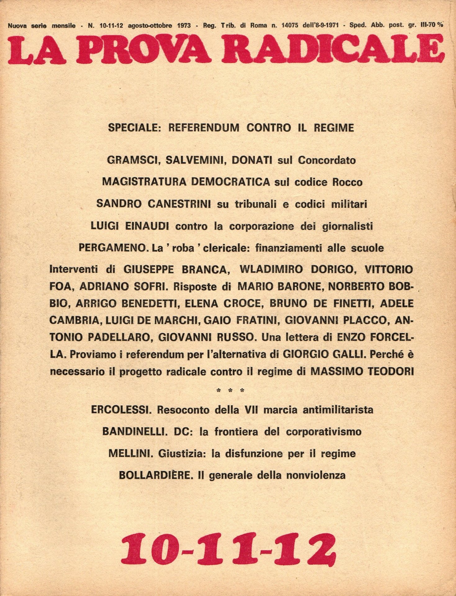 La prova radicale. Nuova serie mensile. Anno II N. 10-11-12. Agosto-Ottobre 1973
