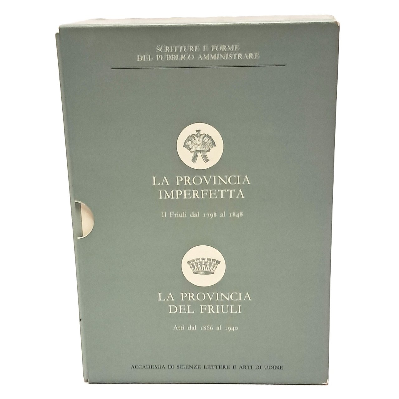 PRIMA EDIZIONE curata da Roberta Corbellini. Opera in due volumi e cofanetto. Scritture e forme del pubblico amministrare, la deputazione provinciale e il suo archivio, legislazione funzioni e istituti della provincia ed inventario degli atti dal 1866 al 1940. Il secondo volume contiene la storia del Friuli in quanto provincia austriaca e fino al 1848 nel Lombardo Veneto. Copertine cartonate e cofanetto. Pp. 730+237. Ottime condizioni.