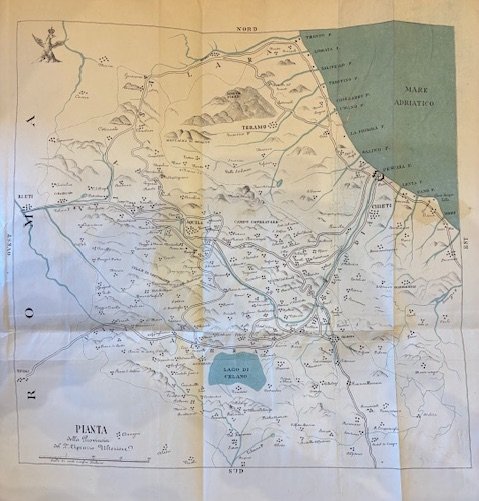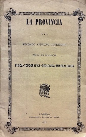 8vo (cm. 26), 55(1) pp. Con una carta litografica a colori ripiegata in fine (topografia della Provincia Aquilana). Brossura editoriale (assente la cop. posteriore). Esemplare in ottimo stato di conservazione. Molto raro. Provenienza: Collezione Spina, Avezzano. Cfr. Parascandolo, n. 102; Zuccarini, n. 557 (senza la carta topografica). Non in Bindi né in Pansa.