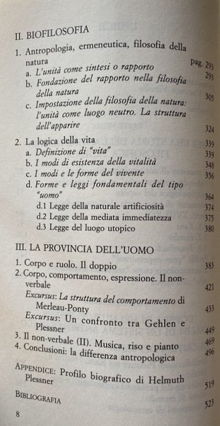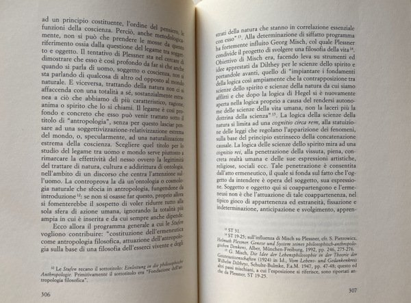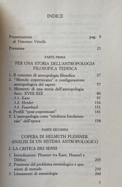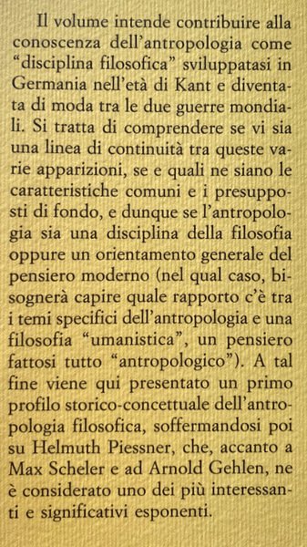 Il volume intende contribuire alla conoscenza dell'antropologia come "disciplina filosofica" sviluppatasi in Germania nell'età di Kant e diventata di moda tra le due guerre mondiali. Si tratta di comprendere se vi sia una linea di continuità tra queste varie apparizioni, se e quali ne siano le caratteristiche comuni e i presupposti di fondo, e dunque se l'antropologia sia una disciplina della filosofia oppure un orientamento generale del pensiero moderno (nel qual caso, bi sognerà capire quale rapporto c'è tra i temi specifici dell'antropologia e una filosofia "umanistica", un pensiero fattosi tutto "antropologico"). A tal fine viene qui presentato un primo profilo storico-concettuale dell'antropologia filosofica, soffermandosi poi su Helmuth Plessner, che, accanto a Max Scheler e ad Arnold Gehlen, ne è considerato uno dei più interessanti e significativi esponenti.
