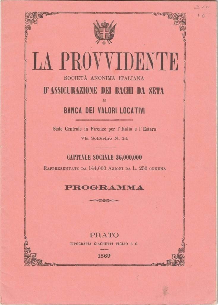 La Provvidente Società Anonima Italiana d’assicurazione dei bachi da seta e banca dei valori locativi – Sede centrale in Firenze per l’Italia e per l’Estero via Solferino, n. 14 – Capitale sociale 36.000.000 rappresentato da 144.000 azioni da L. 250 ognuna diviso in 12 serie di 3.000.000 ciascuna, Programma, Tipografia Giachetti, Figlio e C., Prato 1869, pp. 21, cm 21, rilegatura ed. a filo. Testo di Vitottavio Campanella (nome in calce all’ultima carta di testo). Minima brunitura della carta, per il resto perfetto.