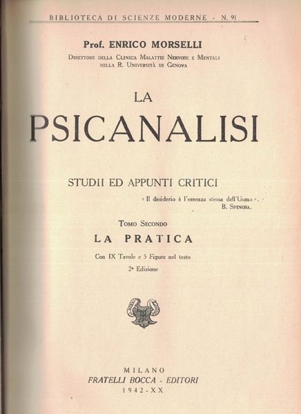 Enrico Morselli, La Psicanalisi. Studii ed appunti critici. Tomo II. La pratica con IX tavole e 5 figure nel testo. 2^ edizione del 1942, Fratelli Bocca Editori, Milano. Collana Biblioteca di scienze moderne.