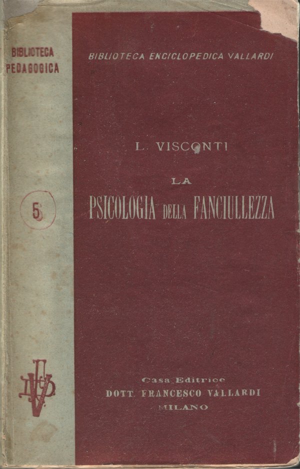 In-16° (cm 19,8 x 12,8), pp. XI, (1), 182, (2), copertina editoriale con tracce d'uso e del tempo (in particolare, piccolo restauro nella parte superiore del dorso e, alla copertina anteriore, piccolo restauro nell'angolo superiore sinistro e mancanza nell'angolo superiore destro, vedi foto). Leggerissimi, piccoli segni d'umido all'occhietto e a p. III. Normale patina del tempo alle pagine, per il resto, in buono stato. Volume numero 5 della collezione "Biblioteca pedagogica", facente parte della "Biblioteca Enciclopedica Vallardi". Indice: Introduzione; Capitolo I. Il mondo delle rappresentazioni del fanciullo; Capitolo II. L'attenzione; Capitolo III. Memoria ed associazione; Capitolo IV. L'immaginazione; Capitolo V. Il pensiero logico ed il linguaggio; Capitolo VI. La vita affettiva del fanciullo; Capitolo VII. Le varie forme dell'attività pratica; Capitolo VIII. La psicologia individuale. Conclusione; Nota bibliografica.