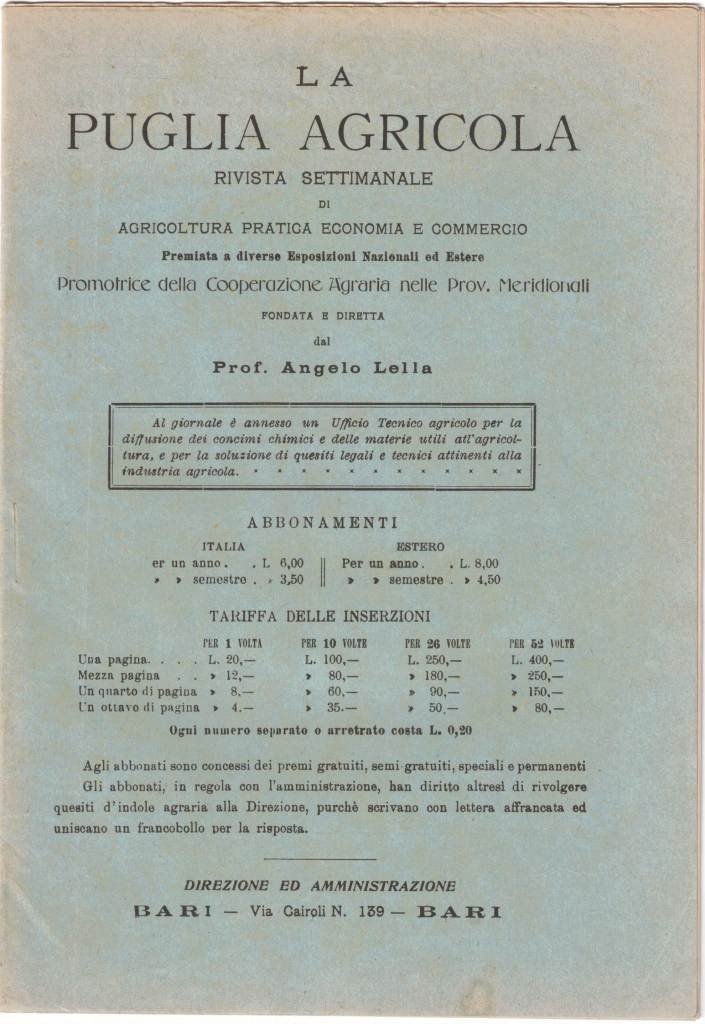 La Puglia Agricola. Rivista settimanale di agricoltura pratica, economia e commercio, direttore responsabile Angelo Lella, s.n., Bari (ma stampato presso il Premiato Stab. Tip. Alighieri), anno XVIII, numero 13, 29 marzo 1914, pp. 193-208 (12), cm 24, br. ed. Rivista fondata e diretta da Angelo Lella. Indice: M., Il problema della granicoltura in Italia. Produzione, consumo e dazio doganale – G. B. Martini, Ancora sul solfato di rame nazionale – La Redazione, Le polpe secche di barbabietole nell’alimentazione del bestiame – O. Munerati, La pagina delle concimazioni. Il nitrato di soda – Rivista della stampa. La rincalzatura del frumento e l’allettamento – La Redazione, Note pratiche di stagione (L’ingrassamento dei bovini – Salviamo gli ulivi) – Risposte a quesiti. La lavorazione del vigneto in primavera – Notizie varie (L’Assemblea della Banca Meridionale – Società Agricola – Cooperativa tra pescatori – Per la frode dei vini) – Consigli utili (L’imbottigliamento dei vini – Pianta il cece in terre scassate) – Lydia, Per le famiglie (Pulitura dei gioielli – Un pensiero alla settimana) – Quello che si stampa. I fiori coltivati – Cose del giornale – Domande ed offerte – La situazione agricola ed i mercati – Movimento dei prezzi delle derrate. In apertura e chiusura del fascicolo, diverse pagine di annunci pubblicitari (tra le altre inserzioni: Concimi Catalitici Astro – Società Alfa Laval – Hotel Tordelli, Roma – Attilio Salvadè, Genova – M. Sordi, Lodi – Sarchiatrice Engaddi Leone – Negri e Motolese, Taranto – Vivai Eugenio D’Uliva e F.lli, Pescia – Vivai Paolo Vignoli, Predosa – Ditta Gerlach e C., Milano – Miniera di zolfo in tufo eredi Di Marzo, Avellino – Ditta G. Cusatelli e G. Ricci, Bari – Zappatrice Ideal Leone – Vernice Capselin). Minime tracce d’uso, lievi segni del tempo, per il resto ottimo.