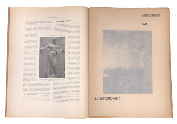18 fascicoli numerati da 1 a 20 (i nn. 13-14 e 16-17 son riuniti in uno) in-folio (cm. 37,6x28), pp. (4 cioè frontespizio annuale e indici) + pp. 168 + 20 TAVOLE fuori testo, perlopiù con velina parlante e impresse a piena pagina in eliotipia dall'ing. Molfese - Fotografie di Edoardo di Sambuy e con 80 ILLUSTRAZIONI nel testo. Brossure editoriali; al piatto una figura monocroma liberty in tonalità seppia (volto di fanciulla con alloro). Fascicoli perfetti, salvo uno strappetto al piatto del n. 1. Commissione artistica: Leonardo Bistolfi, Davide Calandra, Edoardo Calandra, Vittorio Cavalleri, Lorenzo Delleani, Giacomo Grosso, Edoardo Rubino, Carlo Stratta. Le 20 tavole fuori testo in cartoncino: 1. Davide CALANDRA. Statua equestre ad Amedeo di Savoia. 2. Lorenzo DELLEANI, "Pax". 3. PELLIZZA da VOLPEDO "Il quarto stato" . 4. Celestino GILARDI "Ritratto del padre". 5. Vittorio CAVALLERI "Flora alpina". 6. Idem. "Sogno di primavera". 7. Pietro CANONICA "Busto del pittore Pasini. 8. Giuseppe CIARDI "Pastorrelle". 9. Andrea TAVERNIER. "Settembre". 10. Paolo VETRI. "Madonna in S. Vitale a Napoli". 11. Carlo FORNARA "Primavera". 12. Idem. "Autunno". 13. Cesare SACCAGGI "Il voto". 14. Pietro CANONICA "Sogni", busto. 15. Giacomo GROSSO. "Sacra Famiglia". 16. Idem, "Rimpianto". 17. Carlo FOLLINI "fRESCHEZZA VESPERALE". 18. Giuseppe RICCI "Dopo il bagno". 19. Celestino TURLETTI "Il fuoco dell'arte non fa bollir la pentola". 20. Antonio FONTANESI "Ranocchi", acquaforte. Tra gli Autori delle opere raffigurate nel testo, oltre ai predetti; Ed. Rubino, P. Gaidano, G. A. Bazzi, Giovanni Giani, C. Barbella, Cesare Ferro, Francesco Gioli, R. Faccioli, Tancredi Pozzi, C. Pollonera, P. C. Cilardi, G. Carpanetto, S. di Bricherasio, Giuseppe Olivero, Guglielmo Ciardi, Emma Ciardi, Luxoro, Luigi Onetti, Luigi Gioli, Lino Selvatico, Bialetti, M. Gachet, F. Vuagnat, R. Bugatti, G. Piumati, Plinio Nomellini, L. Bazzaro, L. Contratti, Carlo Cressini, G. Belloni, Vittorio Avondo, C. Chiesa, E. Reycend, Ludovico Cavaleri, G. Cavalla, Alessandro Abate. Tra gli SCRITTORI e Poeti segnaliamo: Giovanni FALDELLA, Giovanni CAMERANA ("Note morenti"), Vittorio PICA, NEERA, Zino ZINI, Bernardo CHIARA, Giovanni CENA ("Il vento"). Il fascicolo 13-14 è dedicato a GIACOMO GROSSO (testo di Ercole Bonardi, 2 tavv. e 10 riorod. b.n. n.t.).