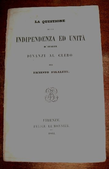 Fascicolo in 12 senza brossura, frontespizio, 67 pp., bianca finale. Attenta analisi della fase attuale della riunificazione nazionale con una visione favorevole alla politica unitaria da parte dell'Autore, il quale, attraverso l'analisi dei motivi etici, sociali, giuridici, di convenienza e di diritto, auspica una soluzione negoziale della questione romana capace d'essere da tutti accettata. Interessante e poco comune.