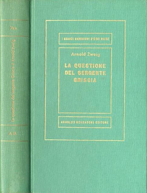 8. ed. 557 p. ; 19 x 12 cm. Medusa, 7 bis. Il protagonista di questo romanzo è un prigioniero di guerra russo, buono e innocente, vittima dell’applicazione disumana di regolamenti e codici che, fuggito da un campo tedesco, viene scambiato per una spia e condannato a morte dopo mille peripezie. Titolo originario dell'opera: "Der Streit um den Sergeanten Grischa". Traduzione dal tedesco di Enrico Burich. Legatura editoriale, coperta in cartone rigido telato di colore verde con impresso il titolo in oro al piatto e al dorso. Manca la sovraccoperta originale ma per il resto libro in buono stato. Codice libreria 4760.