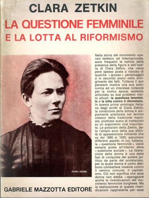 2. ed., riv. e corretta. 237 p. : ill. ; 21 x 15 cm. Cultura e classe, 3. In questa prima antologia italiana degli scritti di Clara Zetkin la condizione della donna è ampiamente analizzata nei termini classici della tradizione marxista, piuttosto avara di trattazioni su un argomento così importante. Le posizioni della Zetkin, dato l'ampio arco della sua attività di appassionata militante che va dal 1880 al 1933, assumono differenti aspetti, in cui, tuttavia, la «questione femminile» viene sempre posta all'interno della «questione sociale». La liberazione delle donne è una delle fasi di conquista del potere politico da parte del proletariato, per la quale donna e uomo debbono combattere insieme contro il nemico comune: il capitalismo e lo Stato borghese. Brossura editoriale, coperta illustrata a colori in cartoncino flessibile plastificato lucido. Qualche leggero segno del tempo alla coperta e alle pagine interne (ingiallimento della carta), per il resto esemplare integro. Codice libreria 8463.