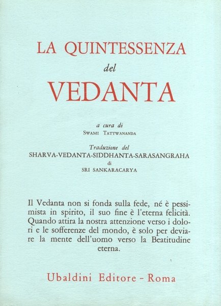 UBALDINI, 1978. In 8°, pp. 148, (4). Brossura editoriale con sovraccoperta. Traduzione del Sharva-Vedanta-Siddhanta-Sarasangraha di Sri Sankaracarya. Collana: Civiltà dell'Oriente.