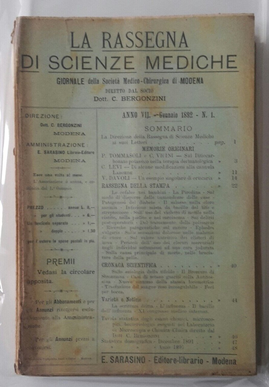 LA RASSEGNA DI SCIENZE MEDICHE SOCIETA' MEDICO CHIRURGICA DI MODENA 1892 ANNATA