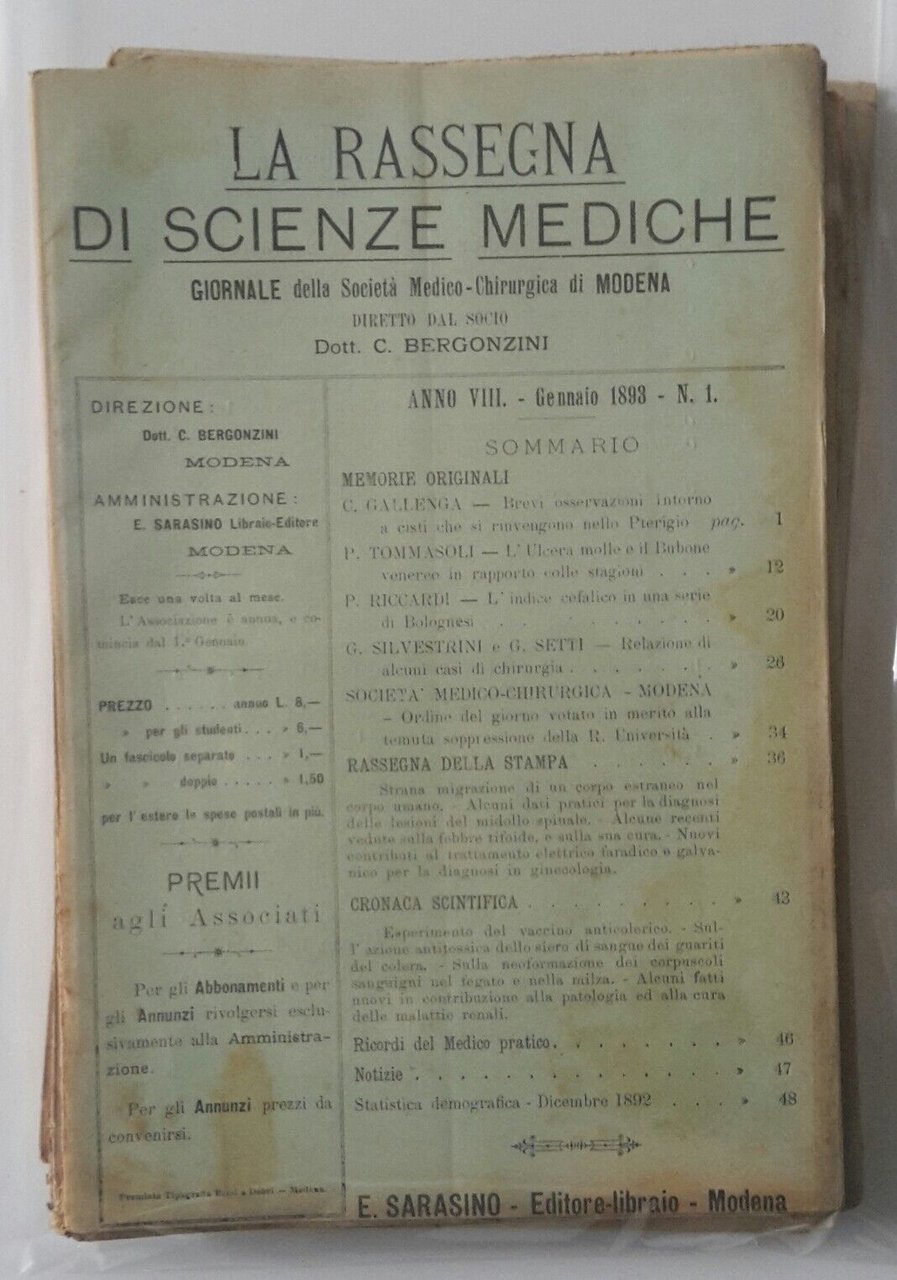 LA RASSEGNA DI SCIENZE MEDICHE SOCIETA' MEDICO CHIRURGICA DI MODENA 1893 ANNATA