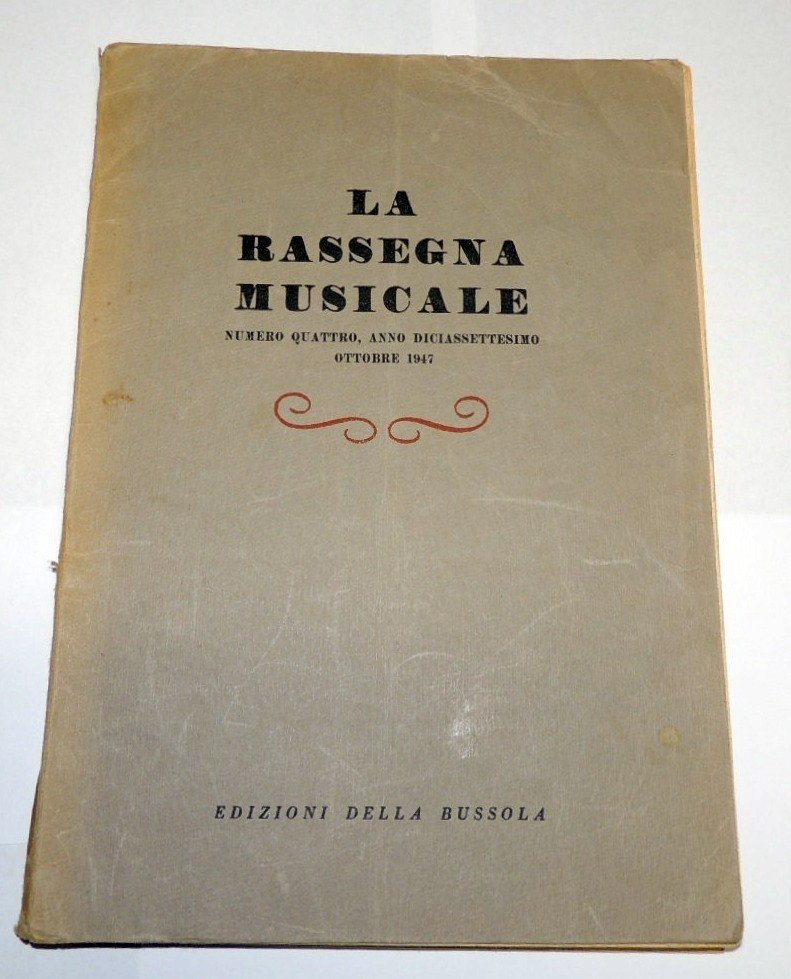 La rassegna musicale, periodico trimestrale, diretta da Guido M. Gatti, Edizioni della Bussola, Roma, anno XVII, n. 4, ottobre 1947, pp. 277-351, cm 25, br. ed. Tracce d'uso alla copertina, minimi strappetti al dorso.