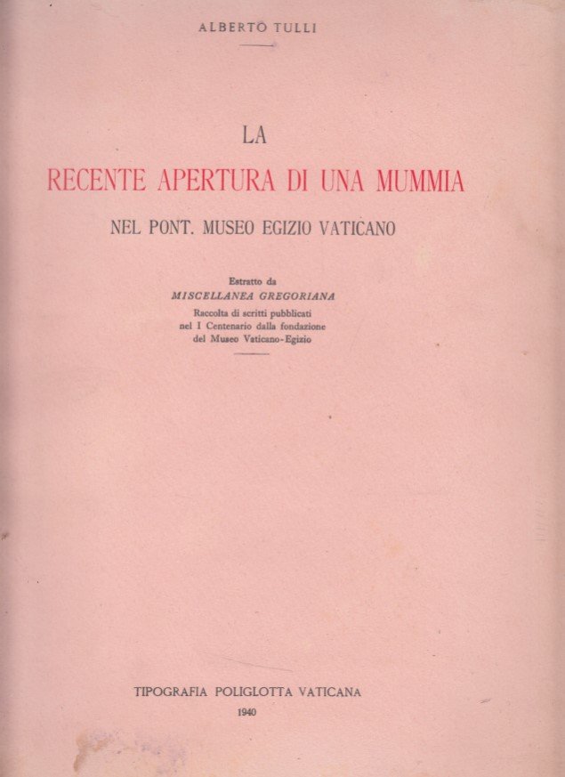 In-4 (Cm 34,5 x 24,5), pp. 70, brossura editoriale. 32 figure bianco nero nel testo che testimoniano l'apertura della mummia . Raccolta di scritti pubblicati nel primo centenario della Fondazione del Museo Vaticano-Egizio. Contiene anche I referti della analisi chimiche eseguite nel Gabinetto Chimico della R. Universita' di Roma. Un luogo di conservazione dell'opera non adatto ha determinato, in alcune parti, il deterioramento della carta con segni tipici della presneza di umidit, sono presenti alcuni lievi segni alla brossura, alle sguardie ed al margine inferiore interno delle pp., piccolo alone e marginale arrossamento al margine alto esterno di poche pp. finali. Piccola mancanza al dorso. Testo in ottime condizioni generali, pienamente fruibile e fresco sia nella parte scritta che in quella iconografica. Opera non comune, estratta da miscellanea Gregoriana, del celebre Egittologi, direttore del museo Egizio Vaticano, Alberto Tulli. MOLTO BUONO