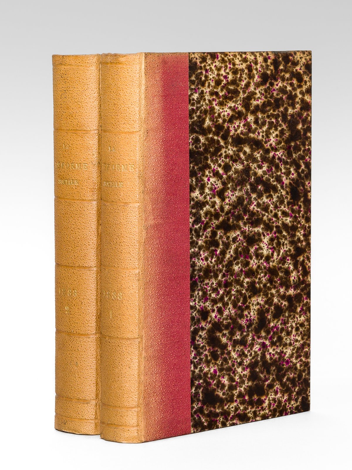 2 vol. in-8 reliure demi-percaline brune, Bureaux de la Réforme Sociale, Paris, 1888, 756 ; 668 pp. : La Réforme Sociale. Bulletin de la Société d'Economie Sociale et des Unions de la Paix Sociale (Huitième Année. Deuxième Série, Tomes V et VI - Année 1888 Complète). Fondée par P.-F. Le Play [ Contient notamment : ] Visite du Lycée Lakanal par Pierre de Coubertin ; L'hospitalité du travail à Auteuil (Duparc) ; Gaulois et Romains (Urbain Guérin) ; Le remède au surmenage et la transformation des lycées de Paris (Pierre de Coubertin) ; Union de Marche et Limousin. Un ouvrier mineur à Lavaveix-lès-Mines (Collinet) ; L'université catholique américaine (Pierre de Coubertin) ; La famille Jougo-Slave au Monténégro d'après la nouvelle codification) Gabriel Ardant - L'imprévoyance dans les institutions de prévoyance (Cheysson) ; Forêts et Bûcherons des Vosges (Charles Grad) ; Les tailleurs de pierre à fusilde l'Orléanais et la situation des paysans solognots (Fénelon Gibon) ; De quelque-unes des causes de la grandeur de la Prusse (Cheysson, Emile) ; etc. Figure importante de la sociologie française, l'ingénieur et réformateur social Pierre Guillaume Frédéric Le Play (1806-1882) vit sont oeuvre poursuivie par de nombreux disciples, dont on retrouvera souvent les signatures dans la revue : Adolphe Focillon, Charles de Ribbe, Émile Cheysson, Alexis Delaire, Henri de Tourville, Claudio Jannet, Edmond Demolins ou Paul de Rousiers. Bon état (qq. rouss.)