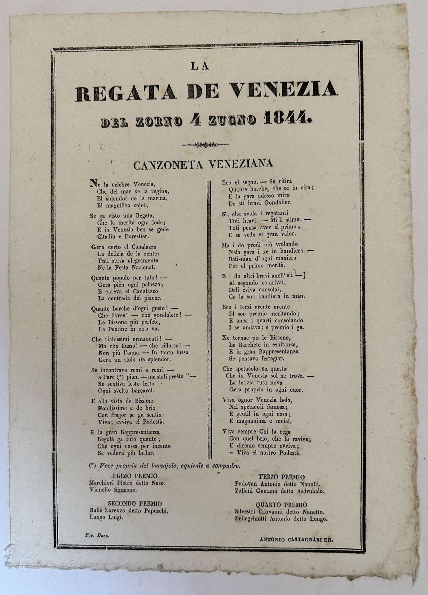 Rarissima canzone dei gondolieri "La regata de Venezia del zorno 4 zugno 1844" scritta in dialetto veneziano Il foglio è stato incollato su un foglio telato. In ottime condizioni. Dim. foglio cm 39,5x33 Dim. foglio telato cm 26,5x19,5