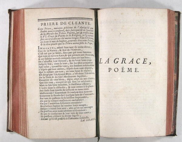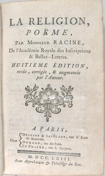 A Paris chez Desaint & Saillant 1763. huitième édition, in/12, reliure de l'époque, dos lisse, orné, pièce de titre en maroquin rouge. Ouvrage en deux parties, XXIV préface ; 328 pages pour : La religion, Poëme.; 143 pages pour : La grace poëme.