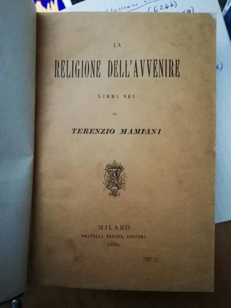 Seconda edizione; della religione positiva e perpetua del genere umano libri sei. Analisi del significato della religione nei suo rapporti con le varie branchie del sapere umano: la scienza, la critica, intuizione del santo, la storia, delle naturali rivelazioni, idea dell'ottima religione. Copertina cartonata. Pp. 491. Rilegato mantenendo la copertina originale in brossura. Ottime condizioni.