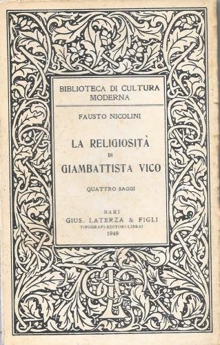 in 8°, pp. 230, bross. edit. ill. Collana: Biblioteca di cultura moderna. Dall'indice: Di un'asserita crisi giovanile religiosa del Vico; L'erramento ferino e le origini delle civiltà; Origine del linguaggio e della scrittura; Ebrei e genti, ovvero origine delle religioni. Ben conservato. 376/31