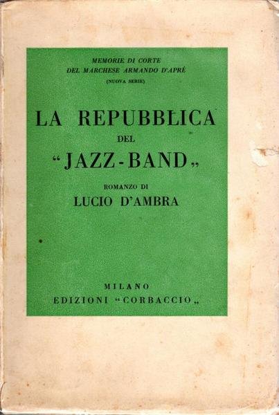 La Repubblica del jazz-band, prima edizione luglio 1929, pp. 401, formato 13,5 x 19,5.<BR>Copertina morbida color crema e verde con titoli in nero. Presente sovraccoperta in acetato.<BR>Piccole fioriture e segni del tempo al piatto inferiore e anteriore. Lieve ingiallimento delle pagine. Nel complesso buone condizioni.<BR>