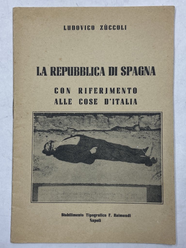 Spillato, cm 18x12, pp (12) illustrate in nero. Opuscolo anticomunista pubblicato “nell’imminenza del referendum” dopo il congresso della Democrazia Cristiana che si pronunziò in favore della posizione repubblicana; contro questa l’autore prende ad esempio la repubblica spagnola per sostenere che ”la repubblica coincide con la dittatura” e attribuisce il voto del congresso ad “elementi periferici, specie nel nord d’italia” del partito, che temono di perdere il favore delle masse: ma la nuova repubblica, teme Zuccoli, non potrà che essere irreligiosa e anticlericale. Ai democristiani dimentichi degli orrori repubblicani e comunisti Zuccoli ricorda l'enciclica Divini redmptoris (Il comunismo è intrinsecamente perverso) e mostra numerose immagini di cadaveri di religiosi spagnoli assassinati, demolizioni di monumenti religiosi, miliziani indossanti paramenti sacri.