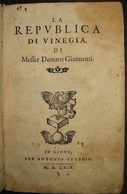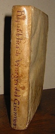 8vo (cm. 16), 219 pp., 1 tav. rip. f.t. (segue) Foglietta Uberto, della Republica di Genova libri II, ibidem 1575, 70 pp., 2 cc.nn. (bianche). Legatura coeva in piena pergamena con titolo ms. al ds. Piccolo taglio alla tav. rip., qualche macchiolina e ingiallitura della carta, ma nel complesso ottimo esemplare.