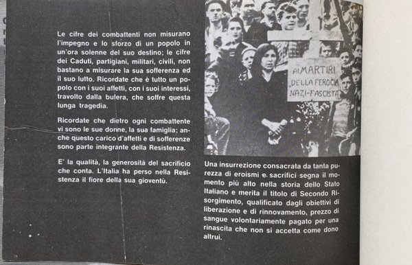 Soggetti: Resistenza italiana, Celebrazioni, Memoria, Storia contemporanea, Novecento, Libri celebrativi, Opuscoli, Libri illustrati da collezione, Collezionismo, Liberazione nazionale, Partigiani, Staffette, Lotta politica, Fascismo, Nazismo, Antifascismo, Antifascisti, Battaglie, Seconda Guerra Mondiale, Germania, Tedeschi, Occupazione, Alleati, Americani, Bombardamenti, Rastrellamenti, Antisemitismo, Fosse ardeatini, Eccidi di massa, Piazzale Loreto, Repubblica sociale di Salò, Savoia, Fuga, Sevizi segreti, Costituente, Padri costituenti, Costituzione antifascista, Quattro giornate, Milano, Napoli, Leggi antiebraiche, Antisemitismo, Ebrei, Campi di concentramento, Deportazioni, Deportati, Esilio, Confino, Prigionieri politici, Ventennio fascista, Benito Mussolini, Morte, Galeazzo Ciano, Hitler, Goebbels, Esercito, Decima Mas, Montagna, Emilia Romagna, CNL, Lotte partigiane, 25 Aprile, Repubblica, Monarchia, Referendum, Comunismo, Comunisti, Monarchici, Unione Sovietica, Russia, 8 Settembre, Armistizio, Badoglio, Libri Vintage Fuori catalogo, GAP, SAP, CLNAI, Linea Gotica, Nazifascismo, Insurrezioni, Rivoluzione, Brigate, Divisioni, Combattenti, Brigata Garibaldi, Osoppo, Canti, Attentati, Via Rasella, Corpo Volontari della Libertà, Guerra Civile, 1943-1945, Donne, Lotta armata, Stragi nazifasciste, Toscana, Forze armate, Ferruccio Parri, Piero Calamandrei, Antonio Gramsci, Giorgio Amendola, Gobetti, Don Minzoni, Delitto Giacomo Matteotti, Benedetto Croce, Manifesto, Intellettuali, Aventino, Consenso, Dissenso, Fratelli Rosselli, Tribunale speciale, Norimberga, Gran Consiglio, Diplomazia, Pace, Re, Numeri, Dati, Morti, Stampa, Regime, Editoria, Titoli di giornali, Quotidiani, Fotografie d'epoca, Versilia, Documenti, Sant'Anna di Stazzema, Vittime civili, Valtellina, Martiri, Guardia di Finanza, Patrioti, Pedescala, Bambini, Goering, Mario Gordini, Bulow, Wilson, Valli Alpine, Carpi, Bologna, Ravenna, Venezia, Trieste, Canavese, Wermacht, Langhe, Inverno, SS, Stampa clandestina, Clandestinità, Ardito del Popolo, Ricostruzione, L'Avanti, L'Unità, Giustizia e Libertà, Democrazia, Il Ribelle, Friuli, Rappresaglie, Roma, Partito d'Azione, Alcide De Gasperi, Paolo Spriano, Nuto Revelli, Giancarlo Pajetta, Antonio Giolitti, Pietro Secchia, Cino Moscatelli, Luigi Longo, Bandiera Rossa, Sandro Pertini, Fiamme Verdi, Palmiro Togliatti, Operazione Sunrise, Claretta Petacci, Dongo, Alfredo Mordini, Michele Moretti, Walter Audisio, Aldo Lampredi, Erich Priebke, Italo Tibaldi, Album, Albi, Partecipazione dei militari italiani, Cifre, Italian resistance, Celebrations, Memory, Contemporary history, Twentieth century, Celebratory books, Brochures, Collectible illustrated books, Collectibles, National liberation, Partisans, Relays, Political struggle, Fascism, Nazism, Antifascism, Antifascists, Battles, Second World War, Germany, Germans, Occupation, Allies, Americans, Bombings, Roundups, Anti-Semitism, Fosse Ardeatini, Mass killings, Social Republic, Savoy, Escape, Secret services, Constituent Assembly, Constituent Fathers, Antifascist Constitution, Four days, Milan, Naples, Anti-Jewish laws, Anti-Semitism, Shoah, Jews, Concentration camps, Deportations, Deported, Exile, Confino, Political prisoners, Fascist period, Death, Army, Mountain, Partisan struggles, Republic, Monarchy, Communism, Communists, Monarchists, Soviet Union, Armistice, Out of print books, Line Gothic, Nazi-Fascism, Insurrections, Revolution, Brigades, Divisions, Fighters, Garibaldi Brigade, Songs, Volunteer Corps of Liberty, Civil War, Women, Armed struggle, Nazi-fascist massacres, Tuscany, Armed Forces, Intellectuals, Consent, Dissent, Special Court, Nuremberg, Grand Council, Diplomacy, Peace, King, Numbers, Data, Dead, Press, Regime, Publishing, Newspaper headlines, Newspapers, Vintage photographs, Versilia, Documents, Civil victims, Martyrs, Patriots, Children, Alpine Valleys, Venice, Winter, Clandestine press, Clandestinity, Reconstruction, Democracy, Retaliation, Rome, Action Party, Green Flames, Albums, Register, Participation of the Italian military, Figures