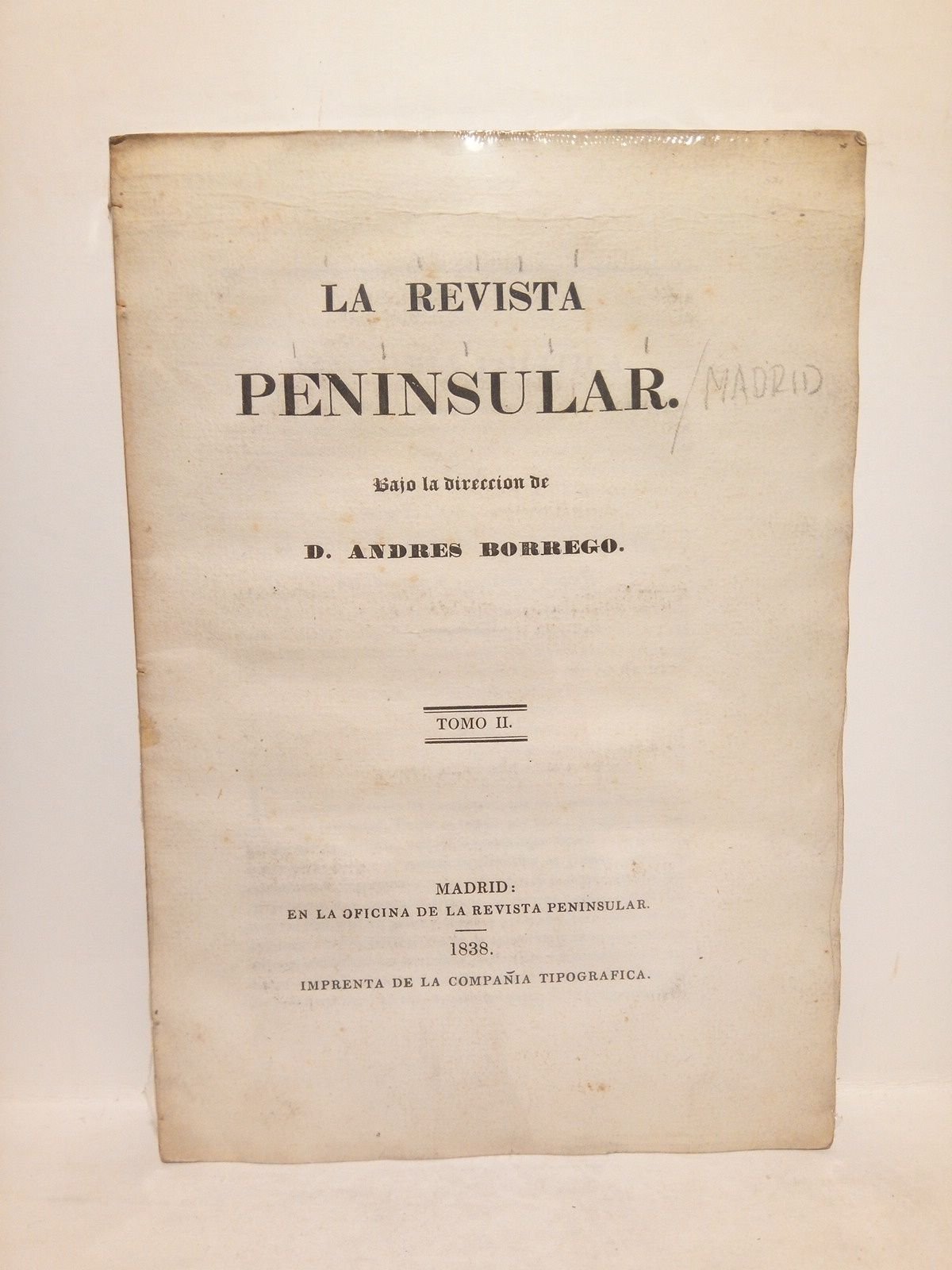 Madrid: Revista Peninsular (Imprenta de la Compañía Tipográfica), 1838.- TOMO II. con 139 p.; 4º menor (20,8 x 14,5 cm); Cubiertas provisionales.- CONTIENE ESTE TOMO II.: Economía Política, por Manuel López Santaella; De los recursos de la producción en Francia y en Inglaterra, (sacado de Statistica Illustrations); Bosquejo histórico de la Revolución Inglesa, formado con arreglo á la obra escrita sobre el mismo objeto por Mr. Guizot, por Manuel Bertrán de Lis y Rives.* Falto de las cubiertas originales, que se han sustituido por otras de papel para su correcta protección. De esta rara revista de corte liberal, solo se llegaron a publicar 2 tomos. Nosotros solo afrecemos el 2º. POLÍTICA ESPAÑOLA DESDE 1833 A 1936