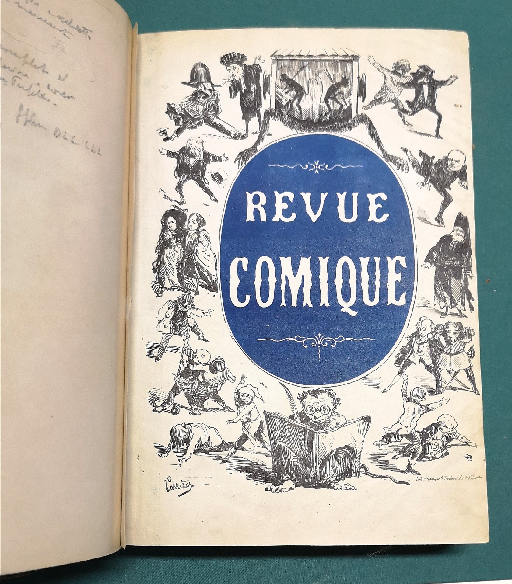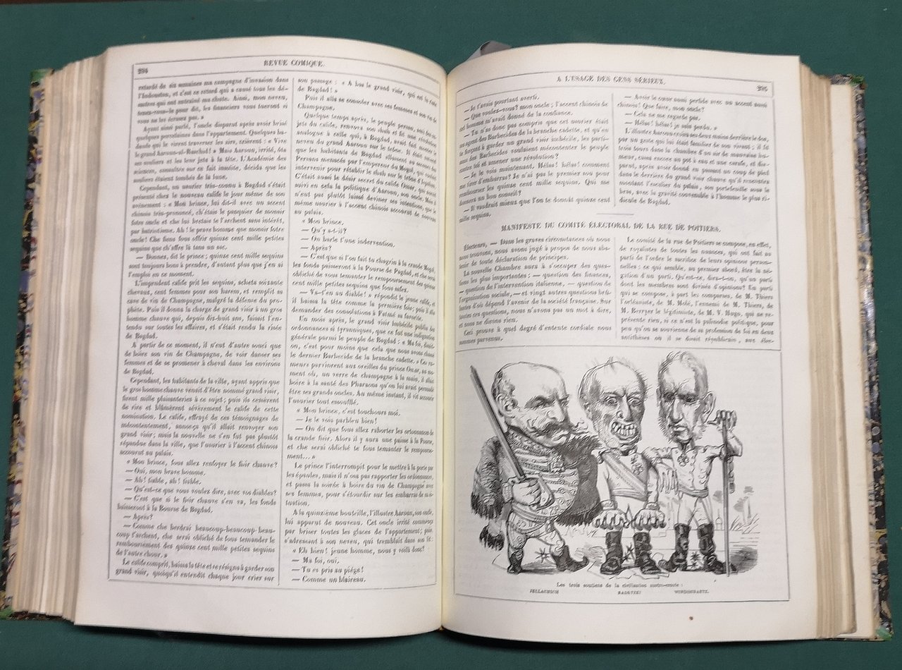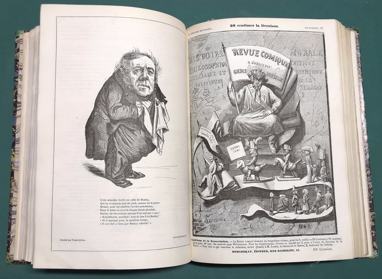 >2 tomi in 1 volume in-4, pp. 368 (tome premier), pp. 188 (tome second), 38 fascicoli in totale, con le belle copertine editoriali figurate, legati in m. marocchino blu coevo, titolo in oro su dorso a nervi. Raccolta illustrata da oltre 600 vignette in silogr. di Bertall, Nadar, Béguin, Otto, Lorentz, ed altri artisti. Redatta da Lireux, Vertot, G. de Nerval, Fauchery, e altri. Collezione completa e rara di questa rivista satirica di indirizzo repubblicano. Rifiutando di sottomettersi alla legge del 27 luglio 1849, che limitava la libertà di stampa, la rivista cessa di essere stampata in dicembre. Perfetto esemplare, freschissimo. Brivois, Illustrés du XIX siècle, p.349-350