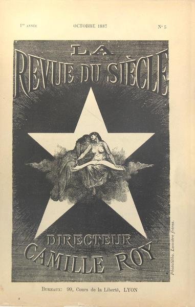 Lyon, 1887. In/8 broché, couverture illustrée (photolithographie des Frères Lumière), 2 planches (héliogravures des Frères Lumière) dont un portrait de Joséphin Soulary, p. 228 à286. Camille Roy (1851-1922) est un poète et chansonnier. D'origine modeste, il apprit la comptabilité et finit par occuper un poste important dans les bureaux d’une banque. En 1886, il réunit ses premiers poèmes en un volume sous le titre Pages d'amour. En 1887, il fonda la Revue du siècle, revue littéraire, artistique et scientifique. Cette revue parut pendant 13 années. Un article sur Joséphin Soulary, un autre signé Aimé Vingtrinier, nouvelles, poésies et chansons.