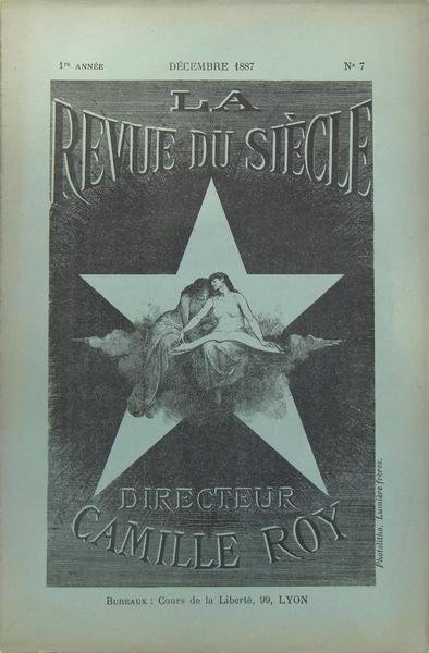 Lyon, 1887. In/8 broché, couverture illustrée (photolithographie des Frères Lumière), 1 planche en héliogravure des Frères Lumière, p. 348 à 406. Camille Roy (1851-1922) est un poète et chansonnier. D'origine modeste, il apprit la comptabilité et finit par occuper un poste important dans les bureaux d’une banque. En 1886, il réunit ses premiers poèmes en un volume sous le titre Pages d'amour. En 1887, il fonda la Revue du siècle, revue littéraire, artistique et scientifique. Cette revue parut pendant 13 années. Un article sur Jules Lemaistre, poésies (Ch. Gros.) et chansons.