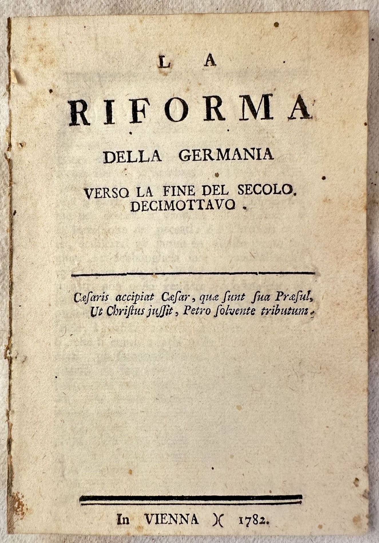 Edizione del 1782, variante C, di questa pubblicazione sulla riforma della Germania verso la fine del XVIII secolo di autore anonimo. In ottime condizioni. In 16. cm 15,5x10,5 cm. Pp. 31+(1). Edition of 1782, variant C, of this pamphlet about the reformation of Germany around 18th century of anonymous author. In very good conditions. In 16. cm 15,5x10,5 cm. Pp. 31+(1).