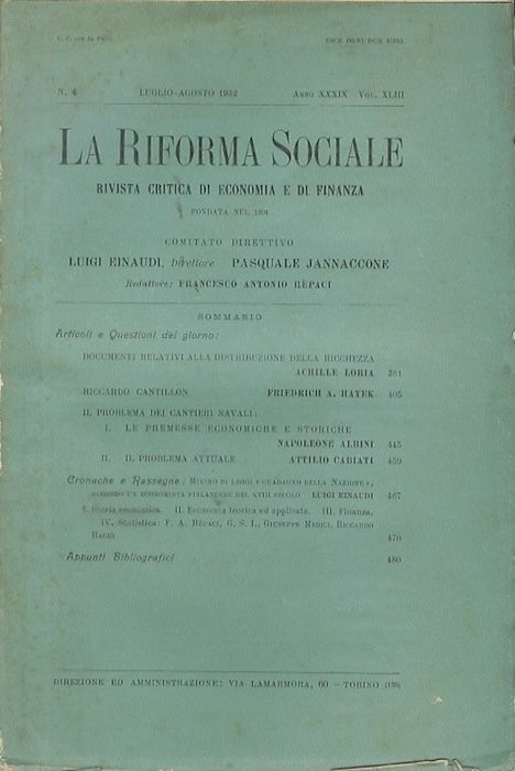 La riforma sociale: rivista critica di economia e di finanza. Anno XXXIX. Volume XLIII. N.4. Luglio-Agosto 1932.