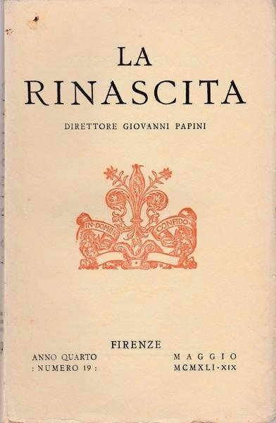 LA RINASCITA DIRETTORE GIOVANNI PAPINI FIRENZE ANNO IV MAGGIO 1941 N. 19 L5751 COPERTINA MORBIDA EDITORIALE CON PICCOLE PIEGHE E STRAPPI AI MARGINI, RIVISTA LEGGERMENTE DEFORMATA, TAGLI IRREGOLARI, LEGGERE FIORITURE A QUALCHE PAGINA, INTERNO IN BUONO STATO DA PAG. 323 A PAG. 494 CM. 25 X 16