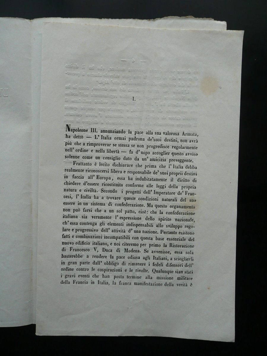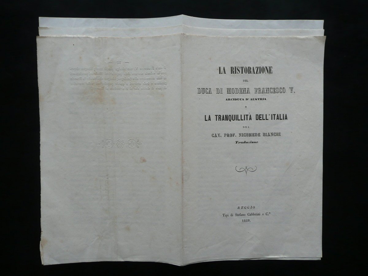 Nicomede Bianchi, La ristorazione del Duca di Modena Francesco V Arciduca d'Austria e la tranquillità dell'Italia del Cav. Prof. Nicomede Bianchi Traduzione Tipi di Stefano Calderini e C., Reggio [Emilia] 1859, cm 22,5x14,5, pp. 16. Esemplare a fogli sciolti. Condizioni di conservazione Esemplare ben conservato con tracce d'utilizzo, alcune piccole leggere bruniture, qualche lieve traccia di piega longitudinale; angoli inf. di qualche pagina con una leggera traccia di pieghetta. Raro opuscolo contro il rientro di Francesco V a Modena, che secondo le tesi dell'Autore avrebbe creato problemi politici all'Italia intera. SC03.D10415 N