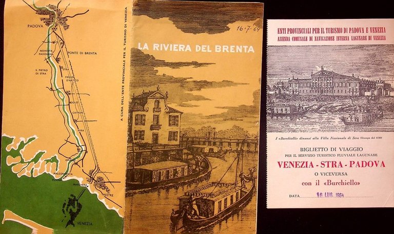 120x210 mm chiuso, 585x210 mm aperto. Condizioni : USATO - Stato : Buono, ordinari segni dell'uso del tempo. Piccola scritta in copertina. Altre note : All'interno riproduzioni fotografiche di Borlui, Fiorentini e Zambon. Depliant a cura di Mario della Costa. In allegato biglietto da viaggio per servizio di trasporto lagunare Venezia-Padova.