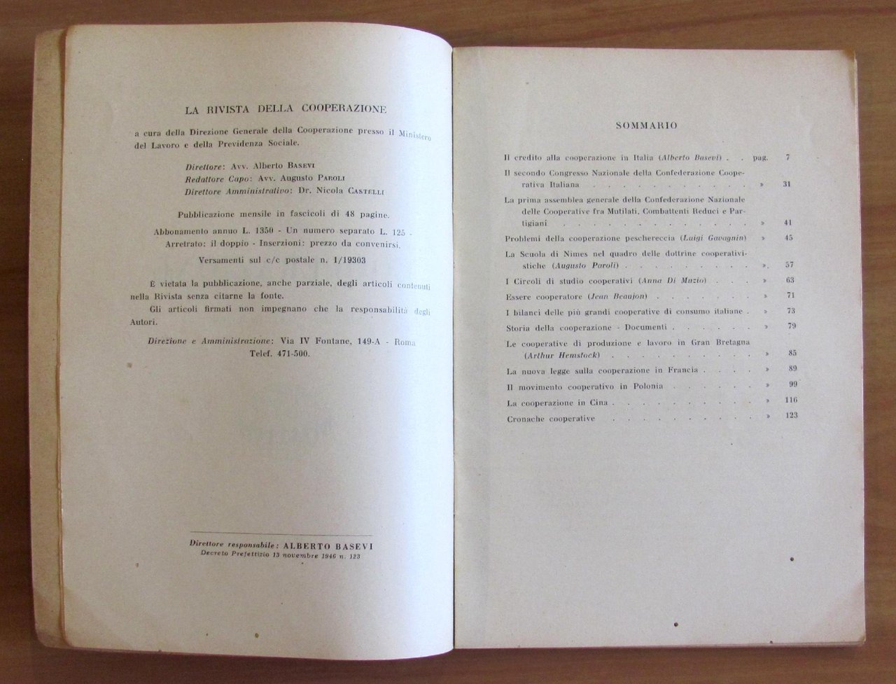 A cura della Direzione Generale della Cooperazione presso il Ministero del Lavoro e della Previdenza Sociale. Ottobre - Dicembre 1947. Brossura editoriale con minime, lievi fioriture del tempo alla sola copertina. 16x23,5; pp.132. Rara e in Ottimo stato. , Molto buono (Very Good)