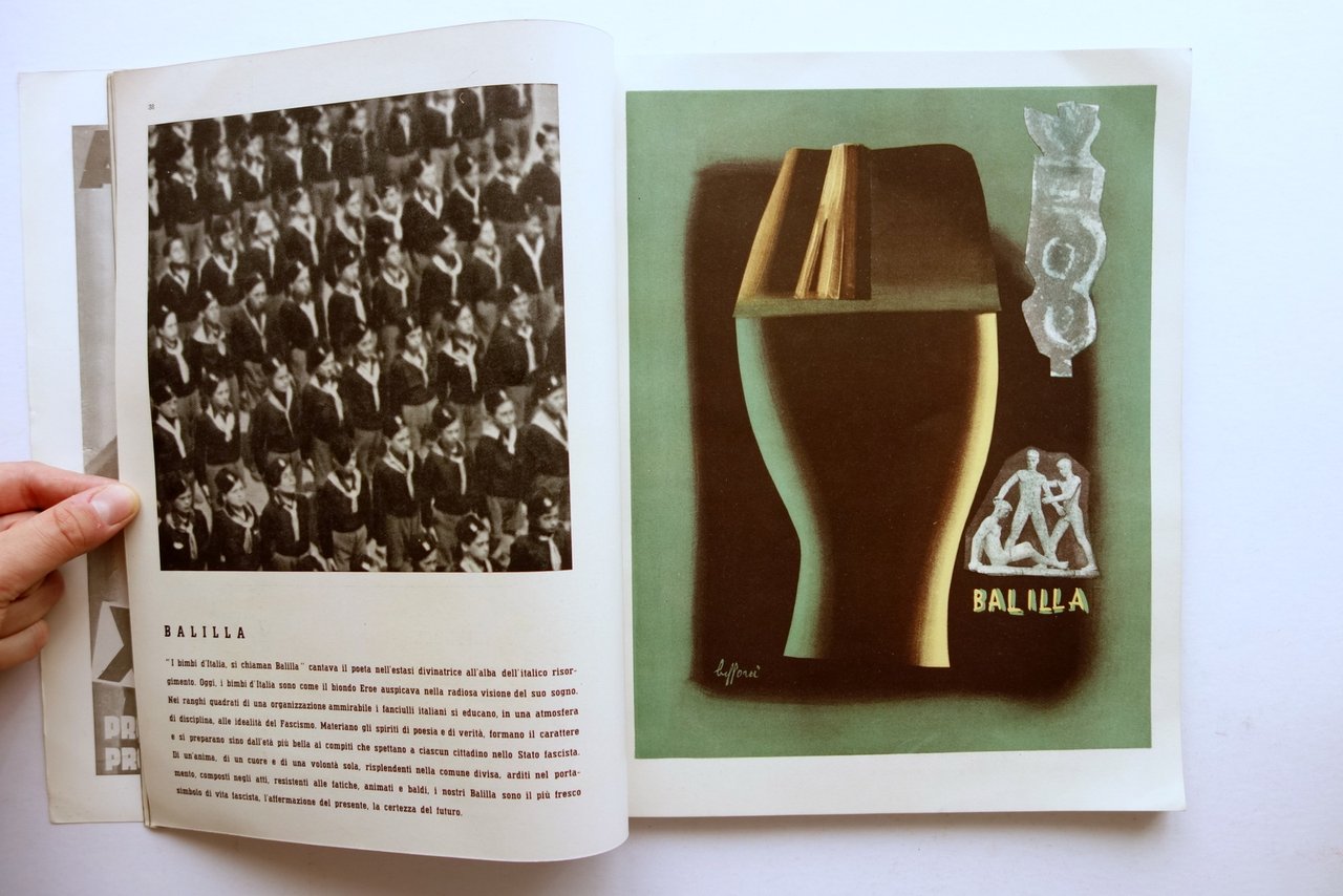 Rivista, La Rivista Illustrata del Popolo d'Italia anno XVII novembre 1938 Alfieri e Lacroix, Milano 1938; cm 34x27; pp. 168 con numerose illustrazioni fotografiche in b/n di cui varie pubblicitarie, più cinque belle tavole a colori su cartoncino dei corpi fascisti realizzate da Buffoni (vedi foto). Brossura ed. con copertina ill. a colori da Garretto. Condizioni di conservazione Buone condizioni con tracce d'uso, brossura ant. con pressoché trascurabili abrasioni, quella posteriore con leggere bruniture; lievi tracce di pieghette agli angoli; al dorso qualche irregolarità e strappetti restaurati mediante riapplicazione. Interni buoni. Importante numero con ampio spazio a eventi e manifestazioni in favore dell'autarchia. Significativa la sezione dedicata ai corpi del regime, corredata da 5 belle tavole a colori su cartoncino di Buffoni raffiguranti, in pieno stile dell'epoca, i vari corpi (vedi foto). Numero completo. SETT58.L23739 N