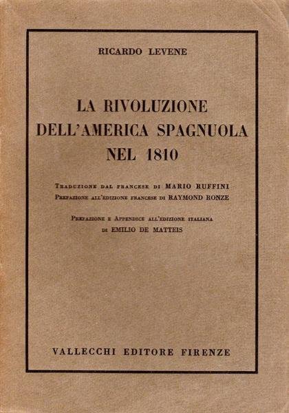 La rivoluzione dell'America Spagnuola nel 1810, prima edizione 1929, pp. 314, formato 13,5 x 19,5.<BR>Copertina morbida di colore grigio con titoli in nero al piatto anteriore e sul dorso. Traduzione dal francese di Mario Ruffini. Prefazione all'edizione francese di Raymond Ronze. Prefazione e appendice all'edizione italiana di Emilio De Matteis. Volume intonso. <BR>Ottime condizioni.