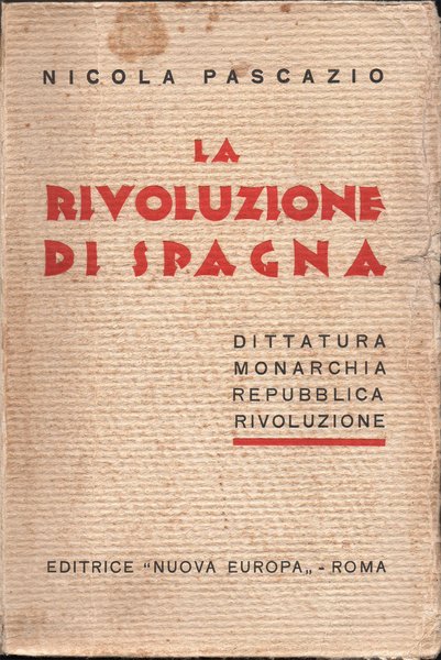 In-8° (22 x 14,7 cm), pp. 478, (2), III, (5), copertina editoriale. Tracce d'uso e del tempo alla copertina, in particolare: nella parte superiore del dorso, un restauro, con carta giapponese, con reintegro, a china nera, di due filetti decorativi e del nome e di parte del cognome dell'autore; nella parte inferiore della cerniera posteriore, piccola fessurazione, di 1,8 cm, sistemata, anche in questo caso, con carta giapponese, carta utilizzata anche per rimarginare alcuni strappetti ai bordi delle copertine. Segni d'umido al taglio di testa. Normale patina del tempo alle pagine, con leggere arrossature ai margini dovute al tipo di carta. Per il resto, ben conservato. In minima parte, intonso. Indice. Cap. I. Il quinto punto cardinale. Analisi d'una razza - L'urto tra la Spagna feudale e la Spagna rivoluzionaria - I mali della Spagna - Le leggi dell'istinto e i doveri della coscienza - L'arte di Birlibirloque. Cap. II. La dittatura di Primo De Rivera e le sue conseguenze. Il clima del colpo di Stato - La funzione legislativa paralizzata - La polveriera del sovversivismo - Il massimo dei beni - Liquidare il Re? - Il rovescio militare di Annual e la responsabilità di Alfonso XIII - Le dimissioni - La fine romantica del dittatore a Parigi - La rinascita dei morbi secolari - Le tre soluzioni. Cap. III. Genesi della Repubblica. Fine della legislazione dittatoriale - Amnistia, liste nere, fuorusciti - Gli ultimi governi della monarchia: un generale; un ammiraglio - La polemica costituzionale - L'influenza dell'esercito - La rivolta di Jaca e le teorie politiche di Galan - L'insurrezione dell'Università - I miei colloqui nel «carcere modello» con i capi della rivoluzione - Si discute pubblicamente il Re - Sanchez Guerra e i «monarchici senza re». Cap. IV. Il crollo della monarchia e la fuga di Alfonso XIII. La crisi secolare: tra la Costituzione e l'assolutismo - L'aristocrazia e i Grandi di Spagna - La tecnica del Re - Come trattava gli uomini politici - Il popolo nelle tenebre - Gli studenti - Gli attentati - Le fucilazioni di Jaca - «Se chiedono la Repubblica.» - Resistere o fuggire? - Le trattative con i rivoluzionari - «Abbasso il Borbone» - A bordo del «Principe Alfonso», verso l'esilio. Cap. V. La Repubblica e gli spagnoli. Il Club della Rivoluzione - Il processo al Re e ai collaboratori della dittatura - Il nuovo dittatore: il Parlamento - Il dominio dei socialisti - La costituzione della Repubblica - L'etica della rivoluzione - I programmi estremisti e il governo della piazza - Il comunismo libertario - Leggi eccezionali - Deportazioni a Villa Cisneros - La stampa - L'epidemia dei conflitti - La tirannia dei pistoleros - Parossismo anticlericale e antimonarchico - La reazione delle destre. Cap. VI. I grandi problemi. I. La questione religiosa e la fine del concordato - II. La Repubblica catalana - III. I nazionalismi e gli Statuti regionali - IV. La questione agraria e l'invasione delle terre - V. Il problema monetario - VI. La politica estera - VII. Il paniberismo e la crisi dell'intelligenza. Cap. VII. La rivoluzione in marcia. Abbiamo fatta la Repubblica; facciamo la rivoluzione - Ebrei e cristiani - Gesuiti e massoni - Rivoluzionari e reazionari - Il problema dei problemi: il disordine - La società dei senza Dio - Lo Stato liberale fu? - Una necessità: rifare lo Stato - Dittatura proletaria e dittatura fascista - La battaglia spirituale della rivoluzione - Il processo di europeizzazione - Bisogna scegliere: Repubblica borghese o Repubblica socialista - La psicologia spagnola e il mondo moderno. Documenti. Testo ufficiale della Costituzione della Repubblica approvata dalle Cortes Costituenti il 9 Dicembre 1931.
