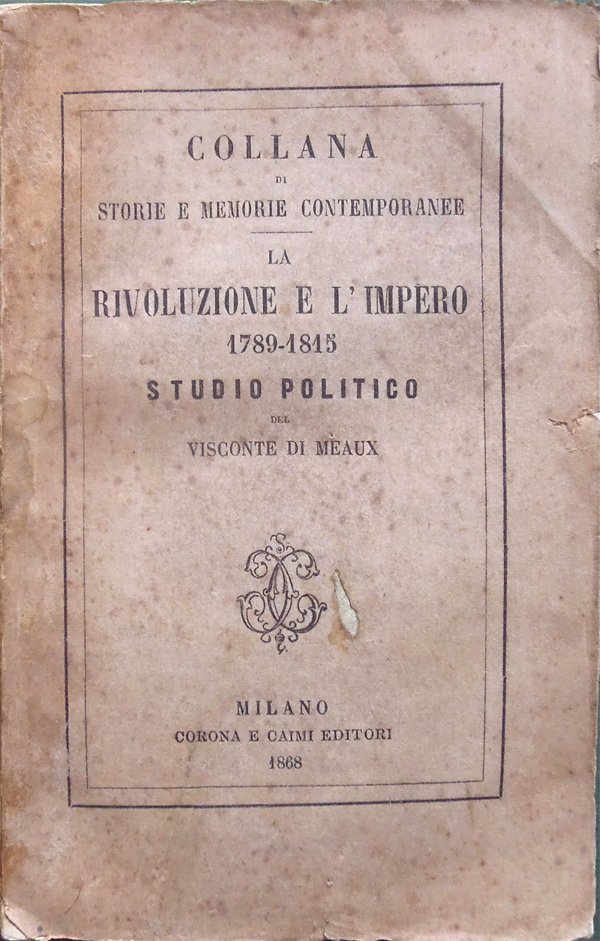 In-16° (19,3 x 12,2 cm), pp. XVII, (1), 7-323, (1), copertina editoriale con mancanze al dorso e una piccola mancanza alla copertina anteriore, reintegrata con carta giapponese applicata alla seconda di copertina. Intonso. Volume trentottesimo nella "Collana di storie e memorie contemporanee" diretta da Cesare Cantù".